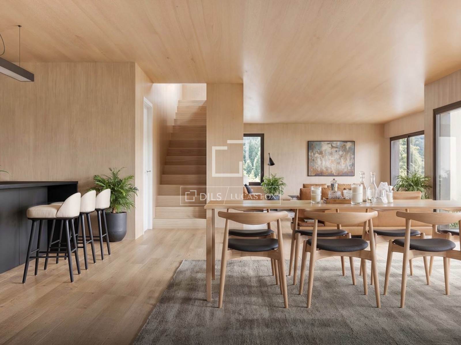 Этот дом отличается современным и функциональным дизайном, нейтральные тона максимально усиливают ощущение простора. В нем также есть большие комнаты открытой планировки и огромные окна, которые наполняют пространство естественным светом, создавая светлую и уютную атмосферу. Кроме того, отсюда открываются потрясающие виды на окружающую сельскую местность, что является настоящей роскошью для наслаждения полным спокойствием.