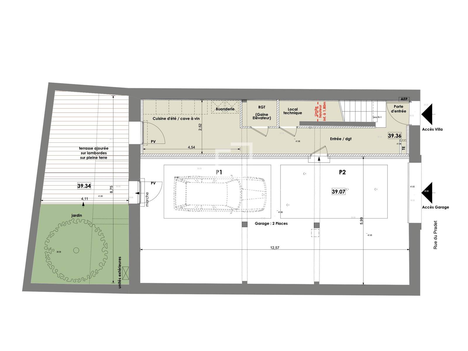 Просторный гараж площадью 72 м² легко вмещает 2-3 автомобиля, мотоциклы, велосипеды, оборудование для настольного тенниса, а также обеспечивает сухое хранение и т.д. Поскольку жилые помещения расположены на первом этаже, на первом этаже оборудована шахта для внутреннего лифта, что позволяет жить на одном уровне.