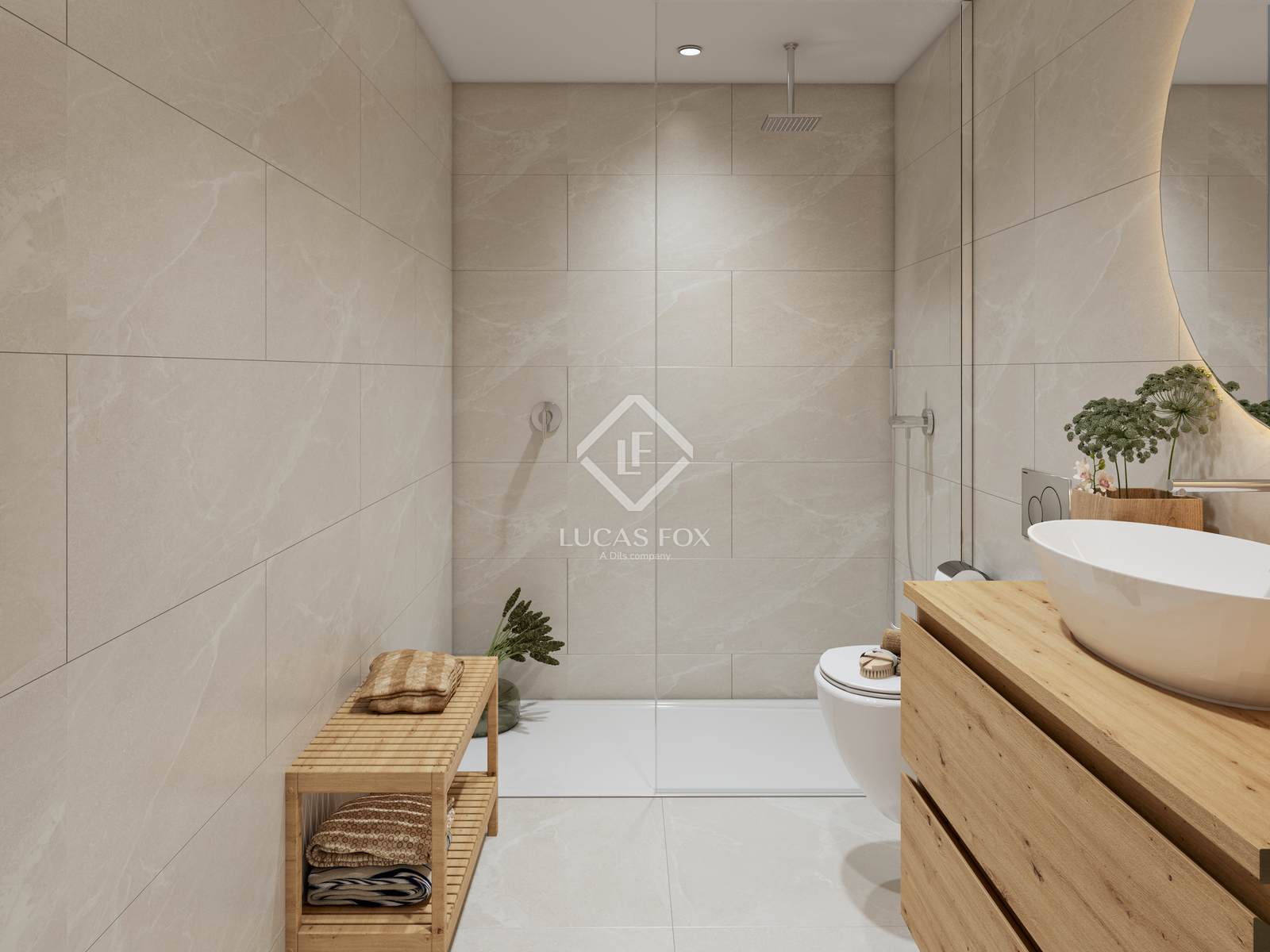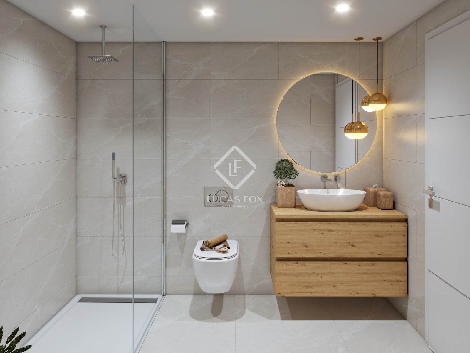 Ванные комнаты отличаются изысканными деталями дизайна, включая подвесную деревянную тумбу под раковиной от Kyrya, встроенный душевой поддон и элегантную встроенную сантехнику от Tres.