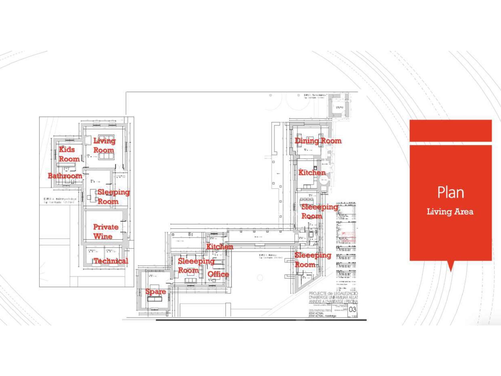 Комплекс организован в отдельные, гармонично сосуществующие зоны. Основная зона включает три независимых жилых здания, спроектированных для комфорта и гибкости использования, будь то основное место жительства, гостевые апартаменты или семейный дом. Эти здания, находящиеся в отличном состоянии, объединены открытыми пространствами, включающими террасы, веранды и сады.
