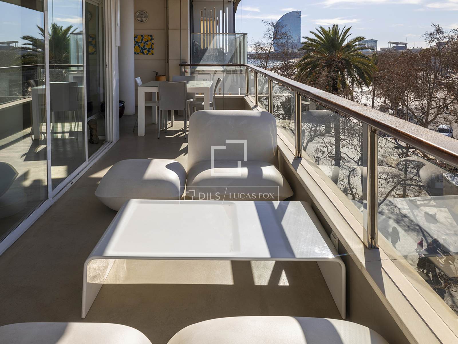 Из главного салона прямо примыкает частная терраса площадью 45 м², с которой открывается вид на яхты порта и панораму Барселоны. Это идеальное место для обедов на свежем воздухе и спокойных вечеров над набережной. Что редкость для городской жизни, каждая комната выходит на улицу, создавая поистине «полностью экстерьерный» дизайн: фасад обращен к морю, а задний – к очаровательным местным улочкам, что обеспечивает сквозную вентиляцию и разнообразные городские виды.
