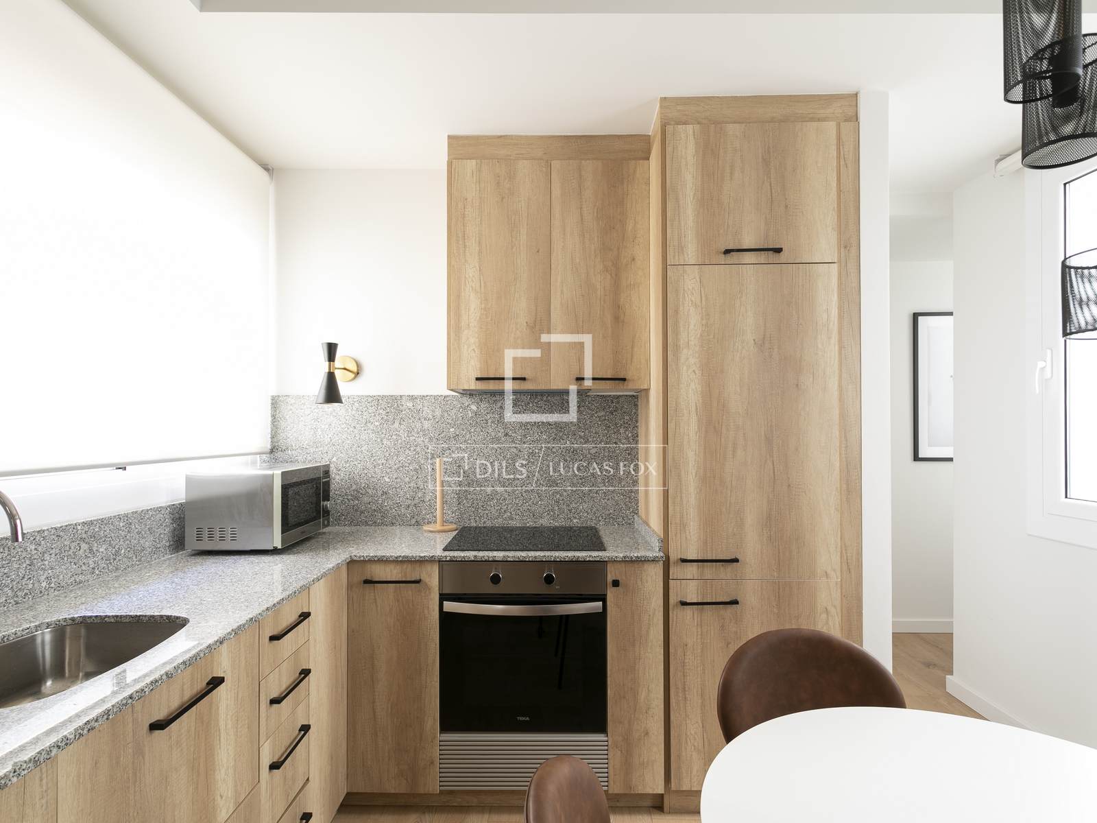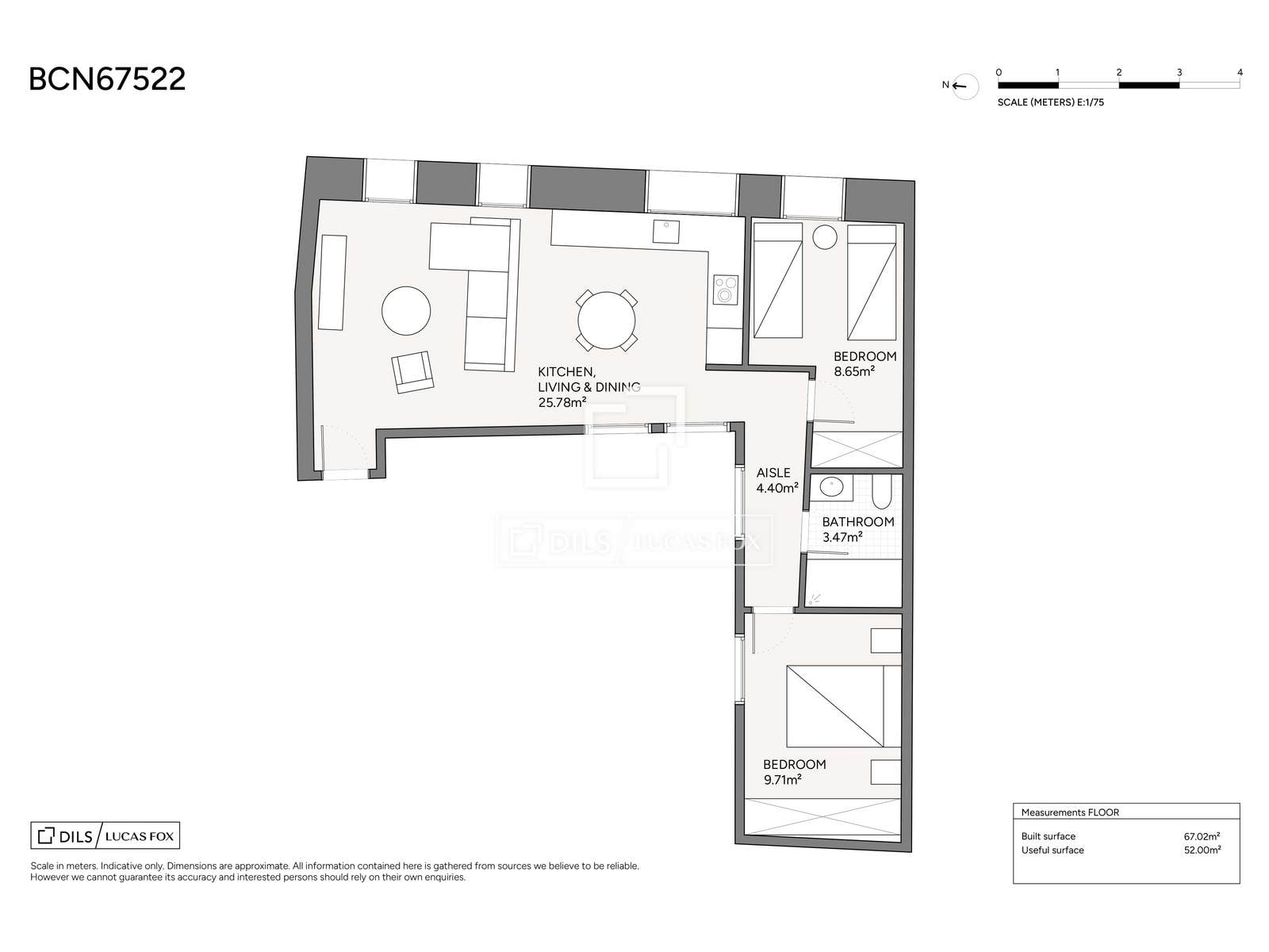 Эта квартира расположена на втором этаже и имеет жилую площадь 67 м². Она включает в себя две спальни с двуспальными кроватями и ванную комнату, отличается функциональной и светлой планировкой. Квартира располагает уютной гостиной-столовой с открытой планировкой, полностью оборудованной кухней и выходом на балкон, а также приятным видом на город.