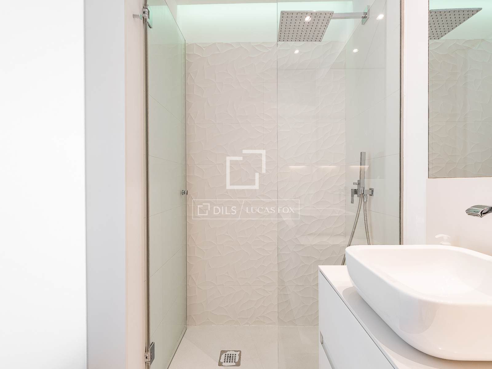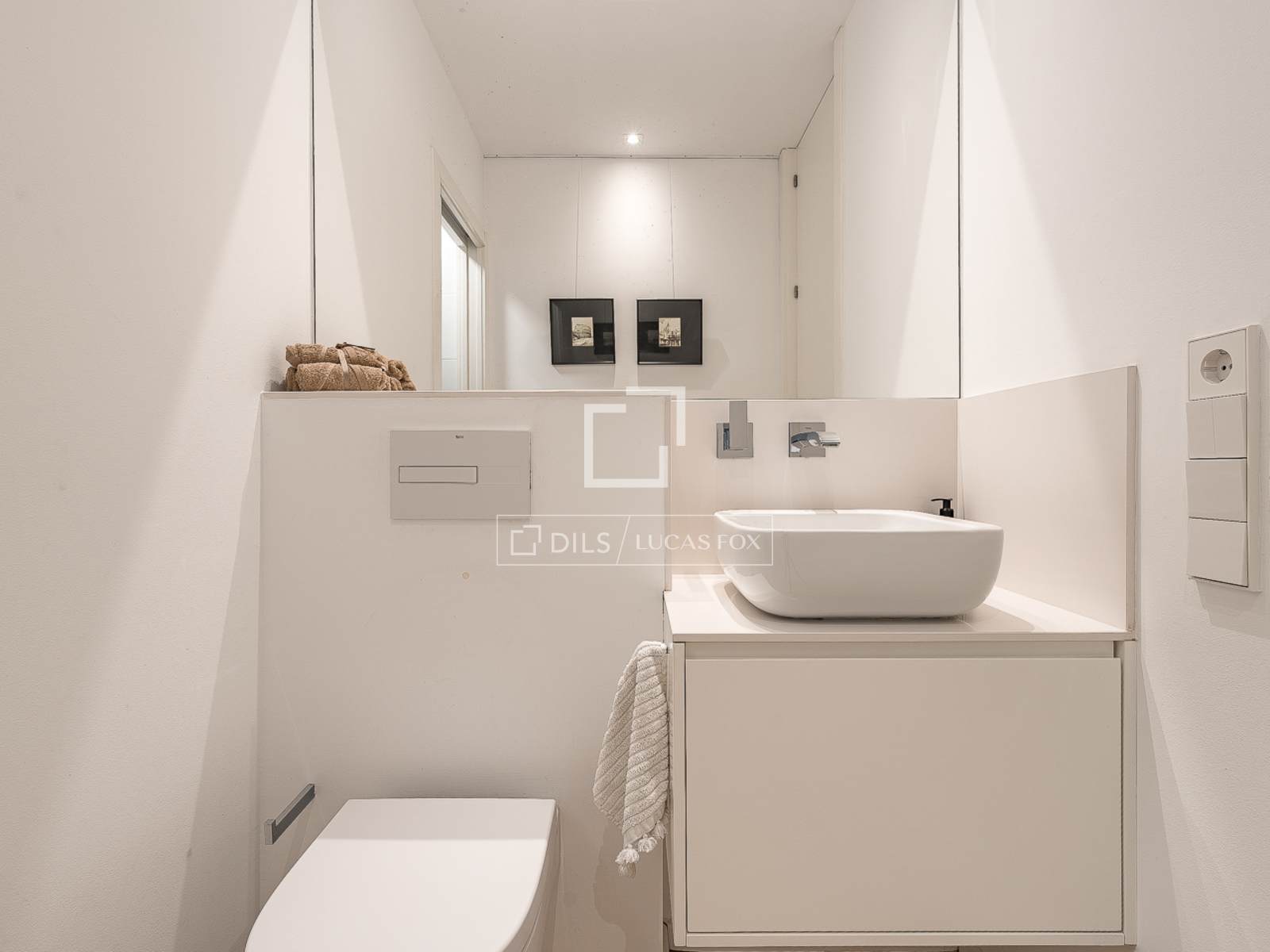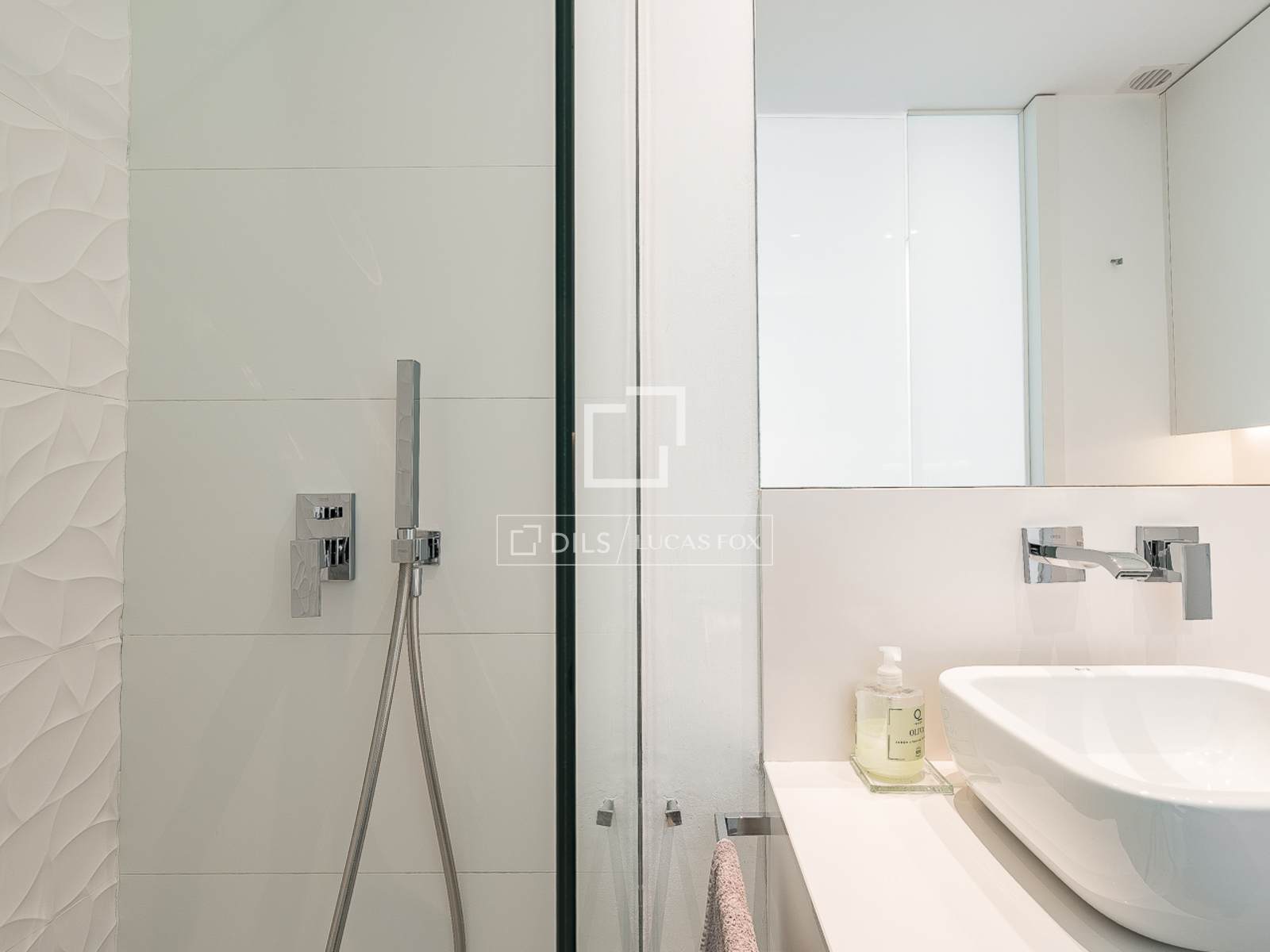 В главной ванной комнате находится душевая кабина с тропическим душем, душевая перегородка, изготовленная на заказ, подвесной унитаз и тумба с раковиной, столешницей из искусственного камня Silestone, смесителями Tres и сантехникой Roca. Гостевой туалет выдержан в том же стиле, с подвесными унитазами и большим зеркалом.