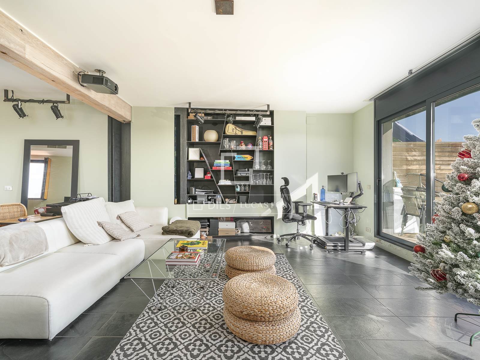 Современный пентхаус-лофт с террасой, выходящей из гостиной, панорамным видом и изысканным индустриальным дизайном.