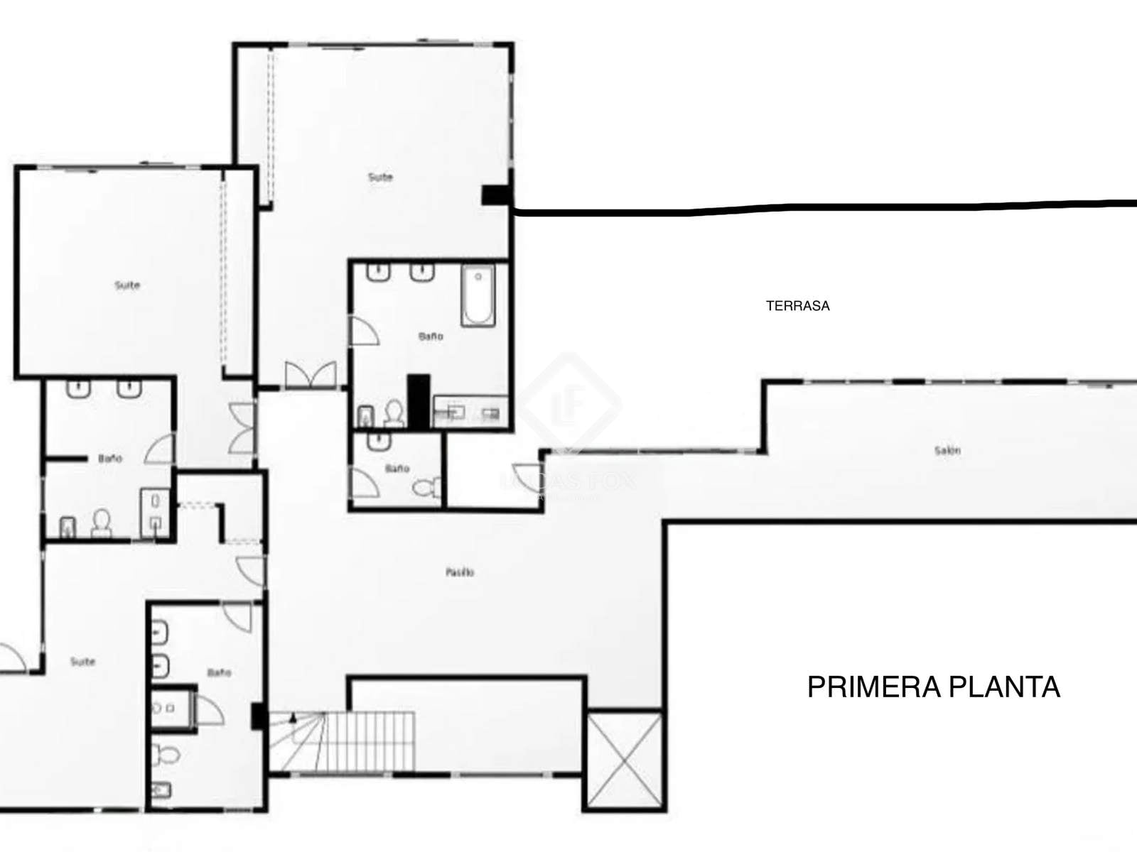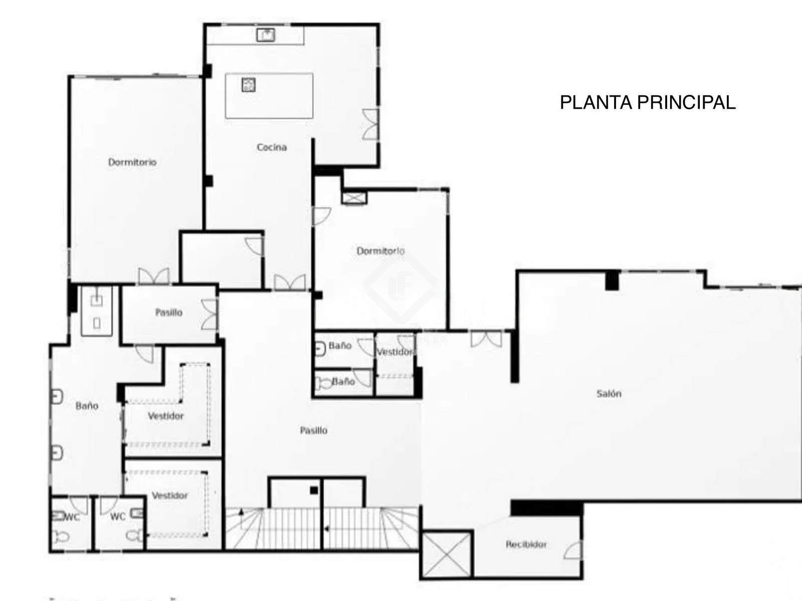 На первом этаже расположены просторная, полностью оборудованная кухня площадью 45 м² с кладовой и обеденной зоной на восемь персон, гостиная с камином и главная спальня площадью 89 м² с двойной ванной комнатой и двумя гардеробными. Большая гостиная площадью 92 м² с потолком двойной высоты очень просторная и элегантная.