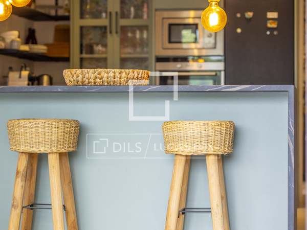 - Открытая кухня, объединенная с гостиной-столовой, полностью оборудована тумбами и колоннами.