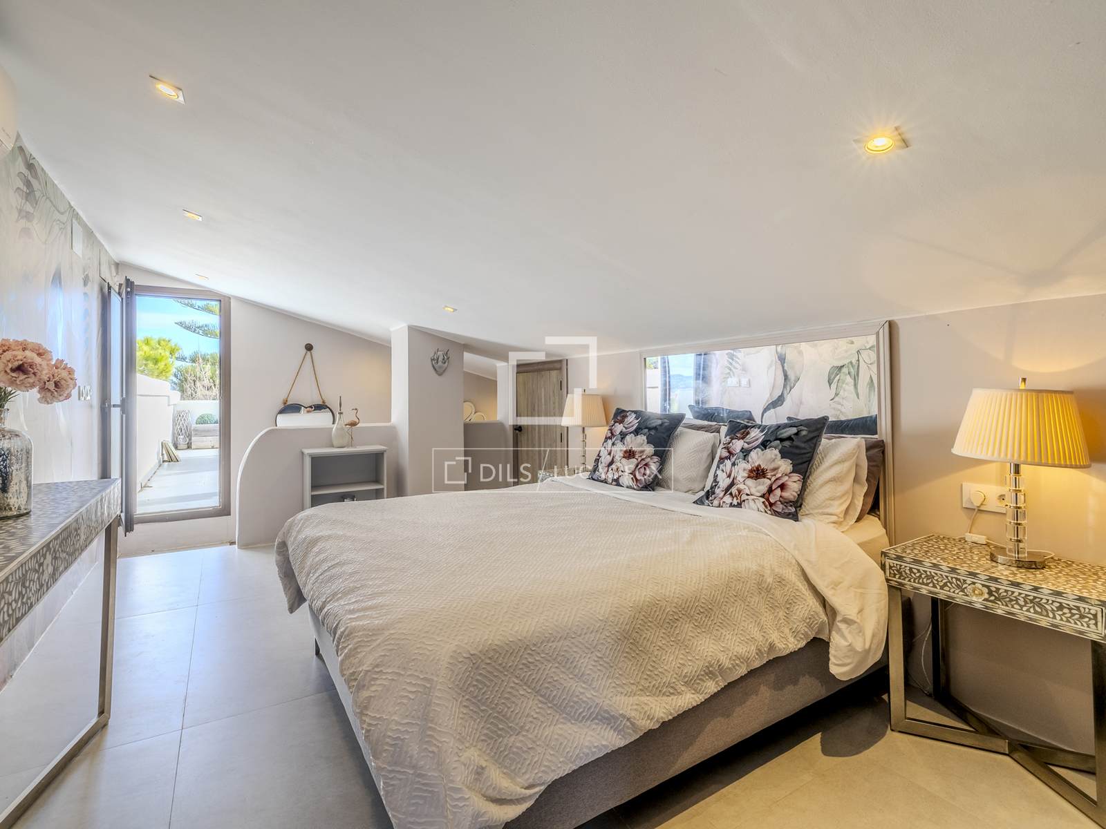 На верхнем этаже расположена шестая спальня с собственной ванной комнатой. Отсюда открываются виды на две частные террасы в передней и задней части дома, а также вид на море.