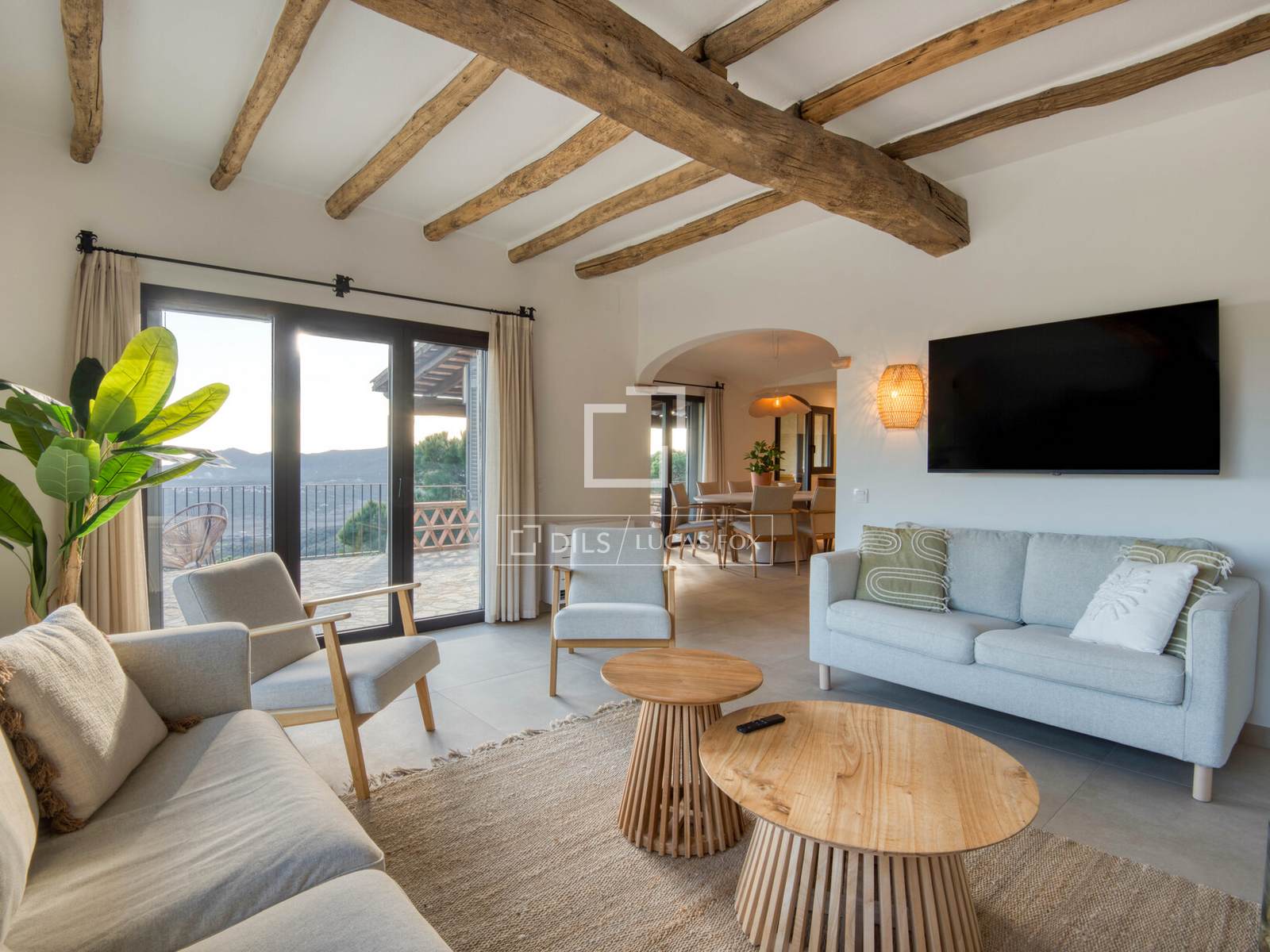 При входе вас встречает просторный холл, соединяющий основные жилые помещения и гостевые апартаменты. Гостиная залита естественным светом благодаря большим окнам и раздвижным дверям, ведущим к морю. Открытые деревянные балки, камин и тщательно подобранная отделка создают теплую, но элегантную атмосферу.