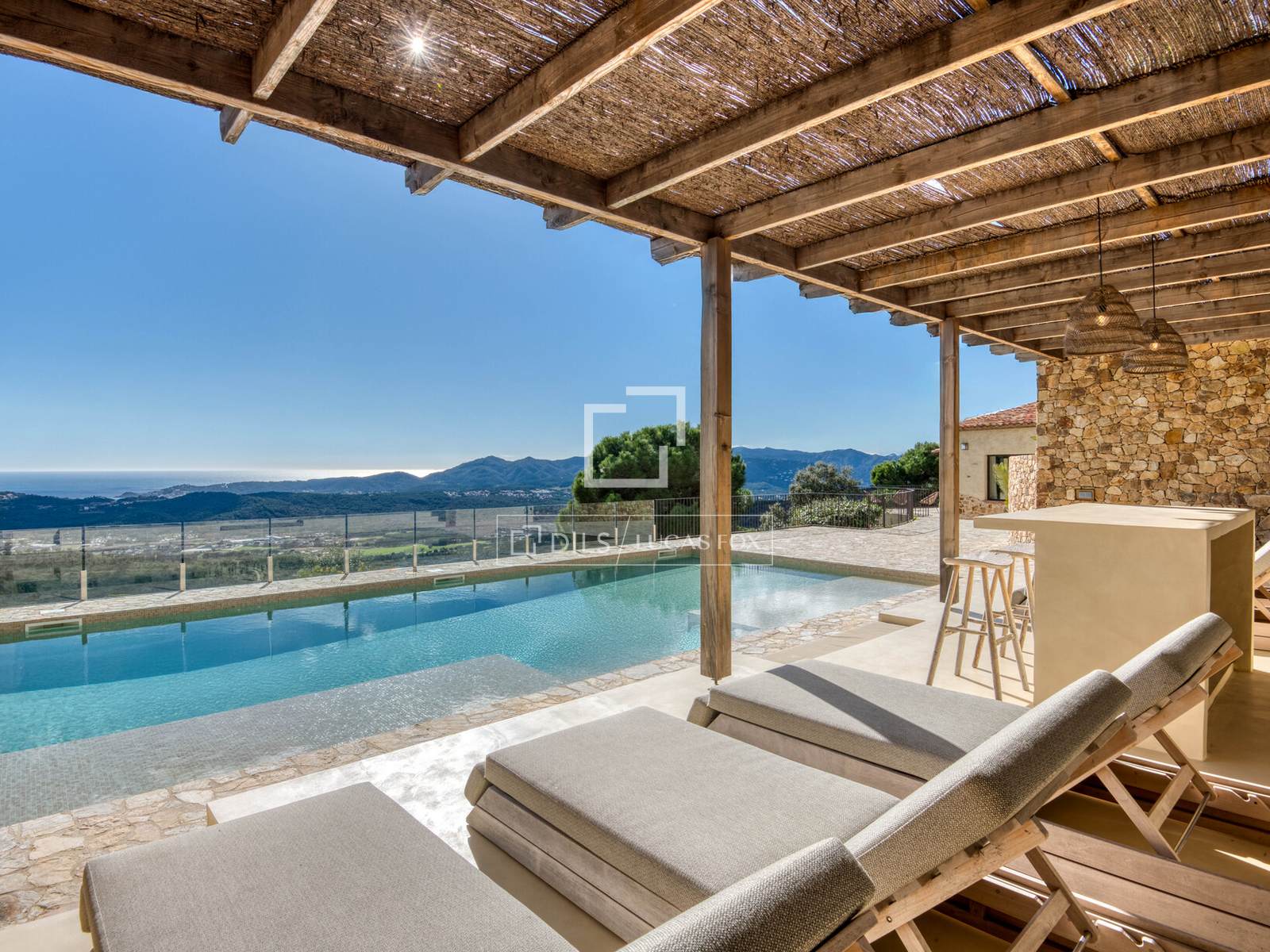 Снаружи, в саду, выходящем на южную сторону, расположена впечатляющая залитая солнцем терраса с большим бассейном с морской водой, открытым баром и крытой зоной для барбекю. Терраса у бассейна, частично огороженная стеклянным забором, позволяет максимально насладиться видом на море и горы, обеспечивая при этом приватность и безопасность. Вилла граничит с охраняемой природной территорией, что создает исключительное ощущение спокойствия.