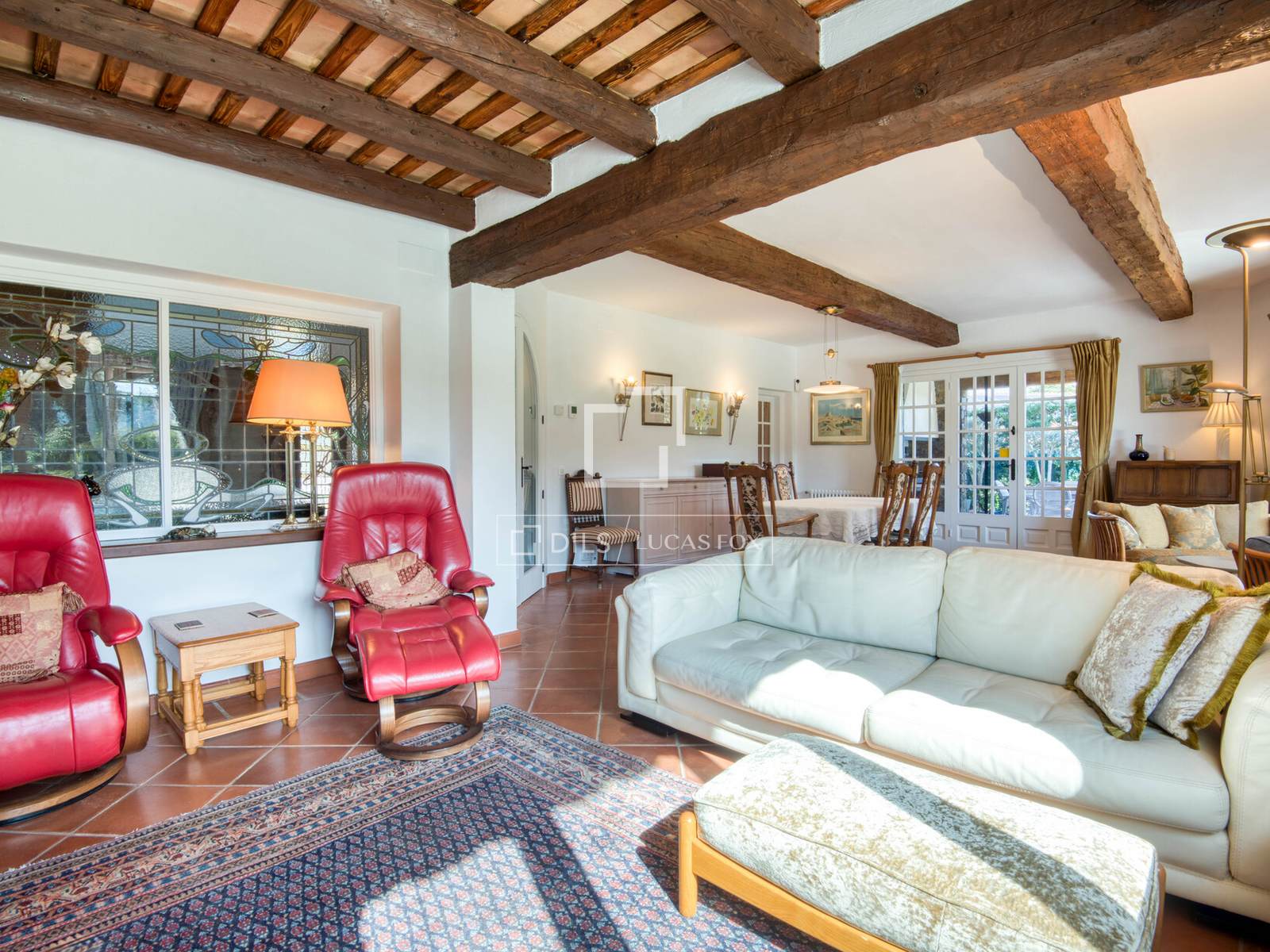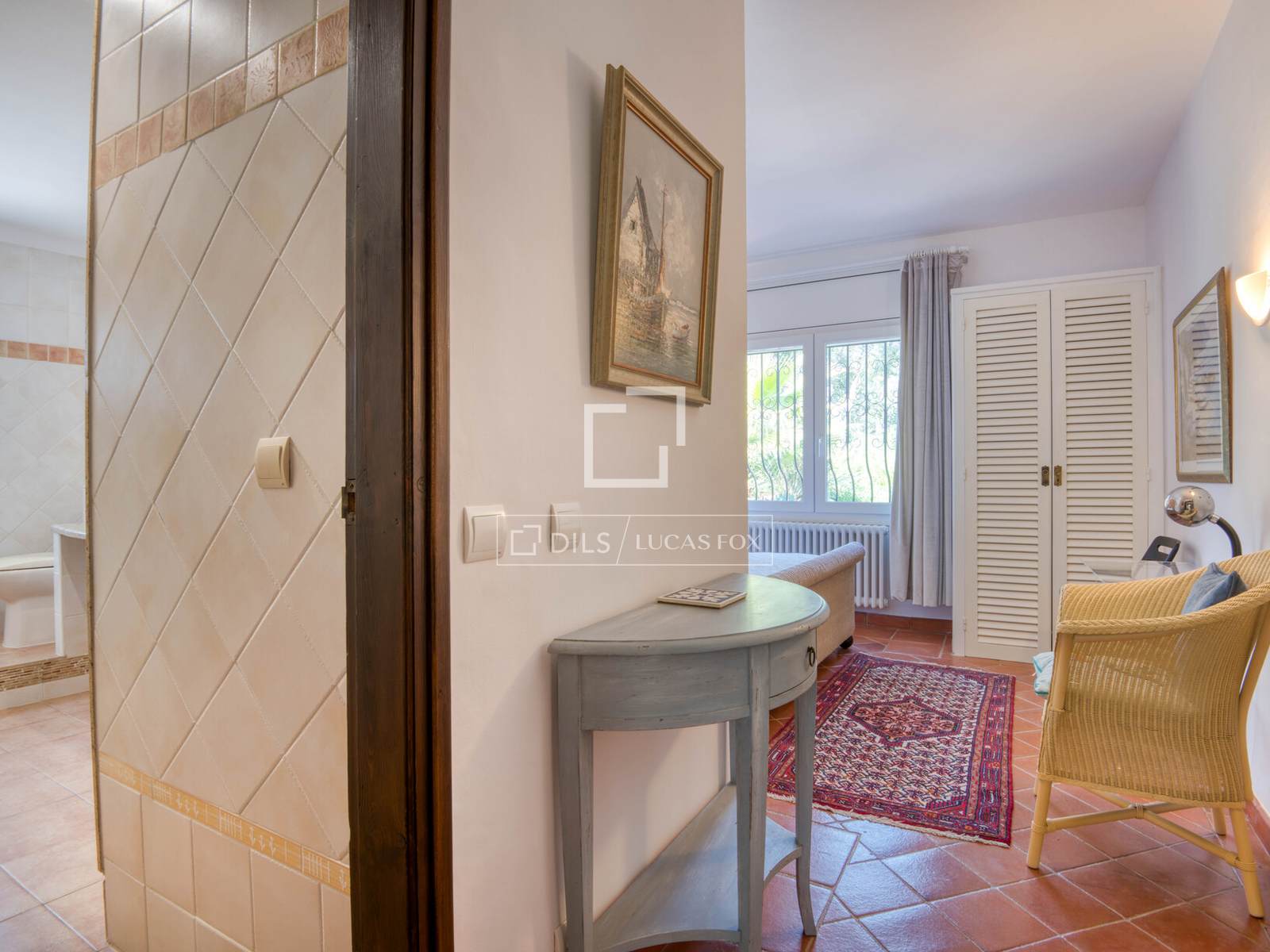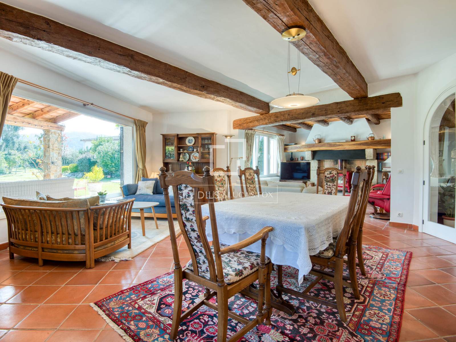 Дом площадью 361 м² расположен преимущественно на одном уровне, что обеспечивает удобную планировку для повседневной жизни, а второй этаж предлагает дополнительные жилые помещения. Из прихожей можно попасть в основные жилые зоны, включая просторную гостиную и столовую, соединенные с большой кухней, образуя уютное пространство для семейной жизни и приема гостей. Интерьеры сохранили привлекательные элементы деревенского стиля, такие как открытые деревянные балки и терракотовые полы, а светлые комнаты имеют прямой выход в сад и на террасы.