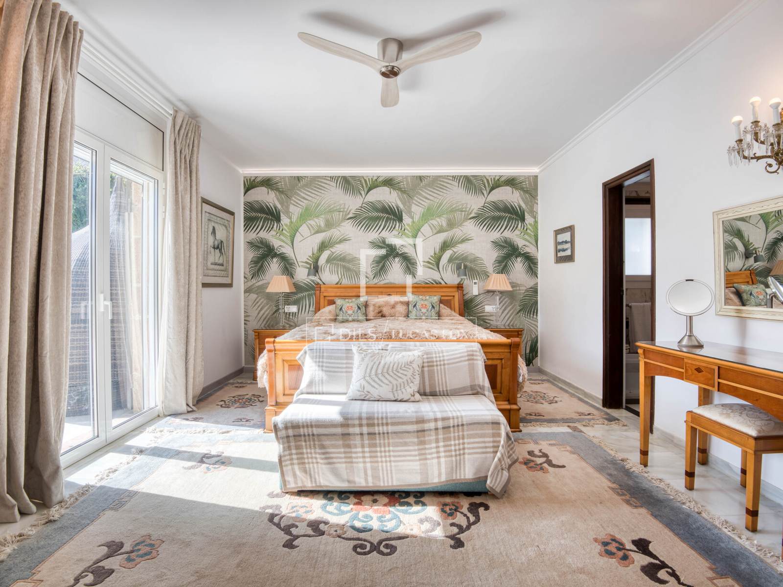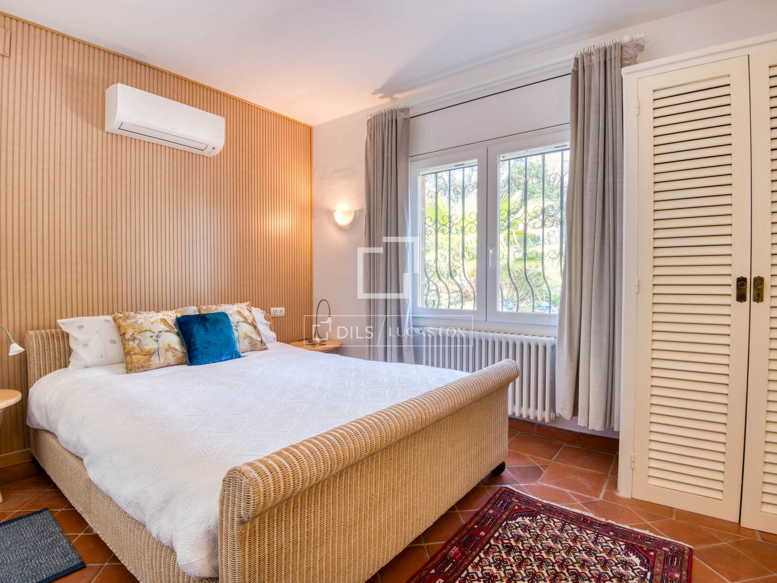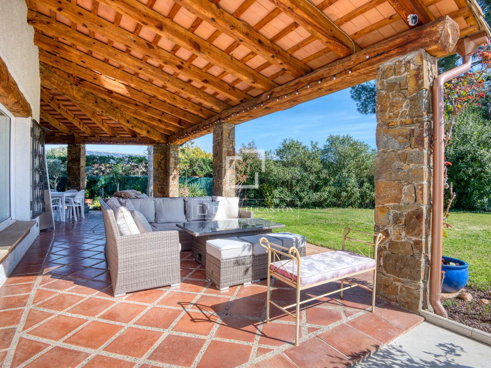 Дом площадью 361 м² расположен преимущественно на одном уровне, что обеспечивает удобную планировку для повседневной жизни, а второй этаж предлагает дополнительные жилые помещения. Из прихожей можно попасть в основные жилые зоны, включая просторную гостиную и столовую, соединенные с большой кухней, образуя уютное пространство для семейной жизни и приема гостей. Интерьеры сохранили привлекательные элементы деревенского стиля, такие как открытые деревянные балки и терракотовые полы, а светлые комнаты имеют прямой выход в сад и на террасы.