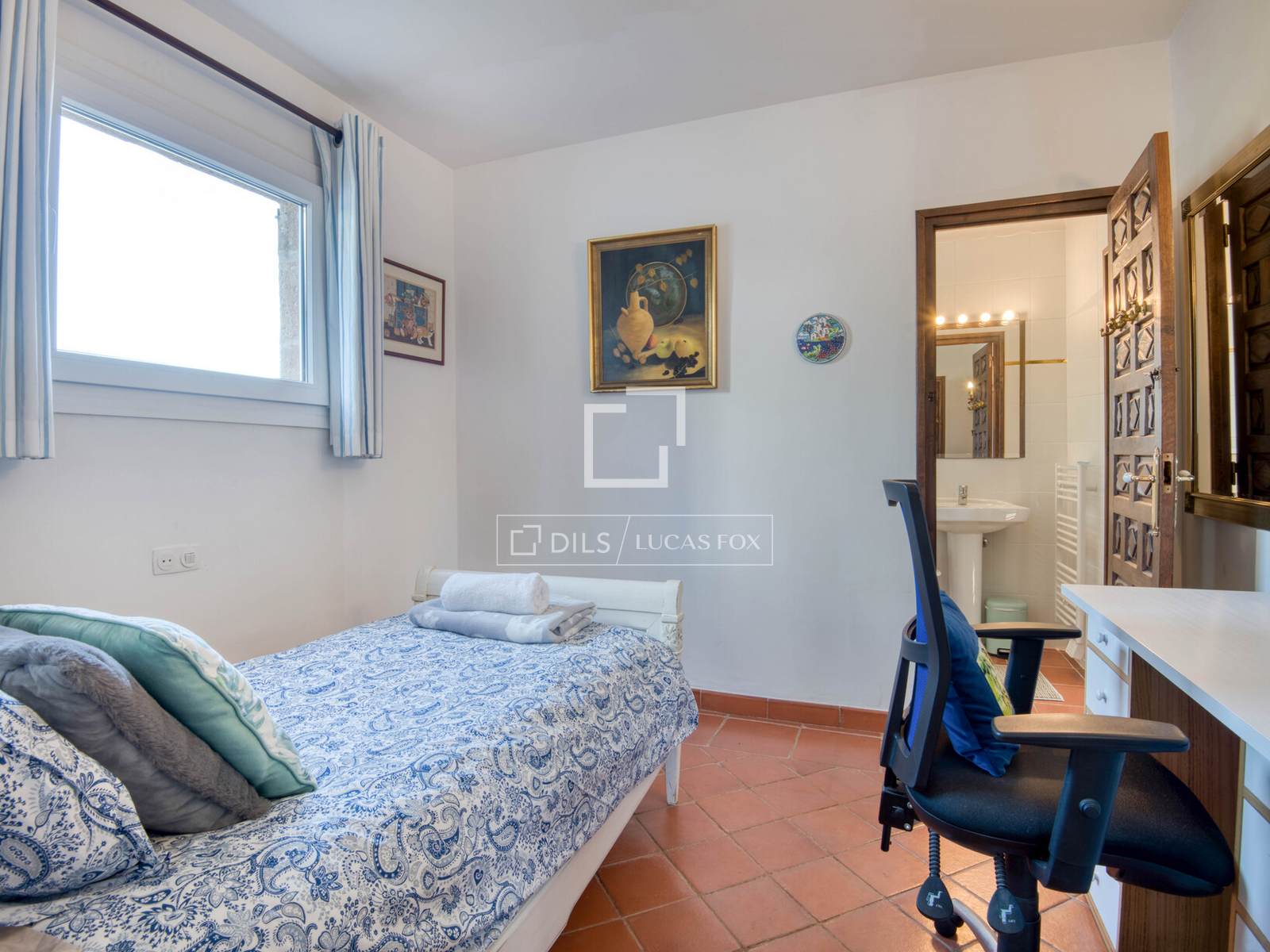 На первом этаже расположены три просторные спальни с двуспальными кроватями, каждая со своей ванной комнатой, а также большой кабинет, подходящий для работы из дома или многофункционального использования. На верхнем этаже находится большая спальня с двуспальной кроватью, ванная комната и еще одна спальня с односпальной кроватью, образующие приватное и многофункциональное пространство, которое отлично подойдет как для гостей, так и для всей семьи.