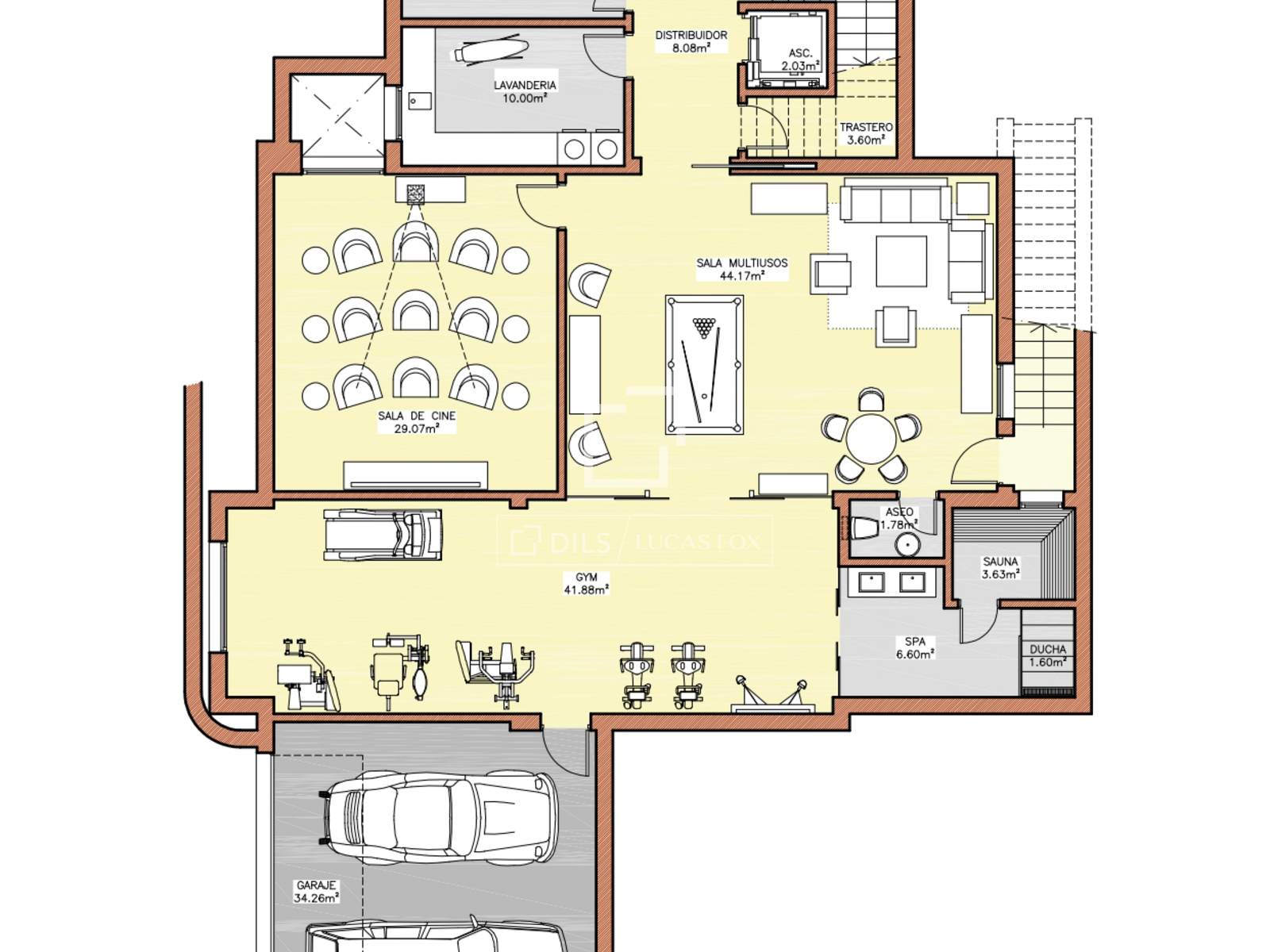 Зоны отдыха и оздоровления: тренажерный зал, кинотеатр, винный погреб, турецкая баня, сауна.