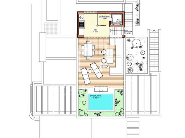 Частный сад с бассейном. Наслаждайтесь солнцем и спокойствием в вашем частном саду, дополненном освежающим бассейном, который идеально подходит для отдыха или проведения встреч на открытом воздухе.
