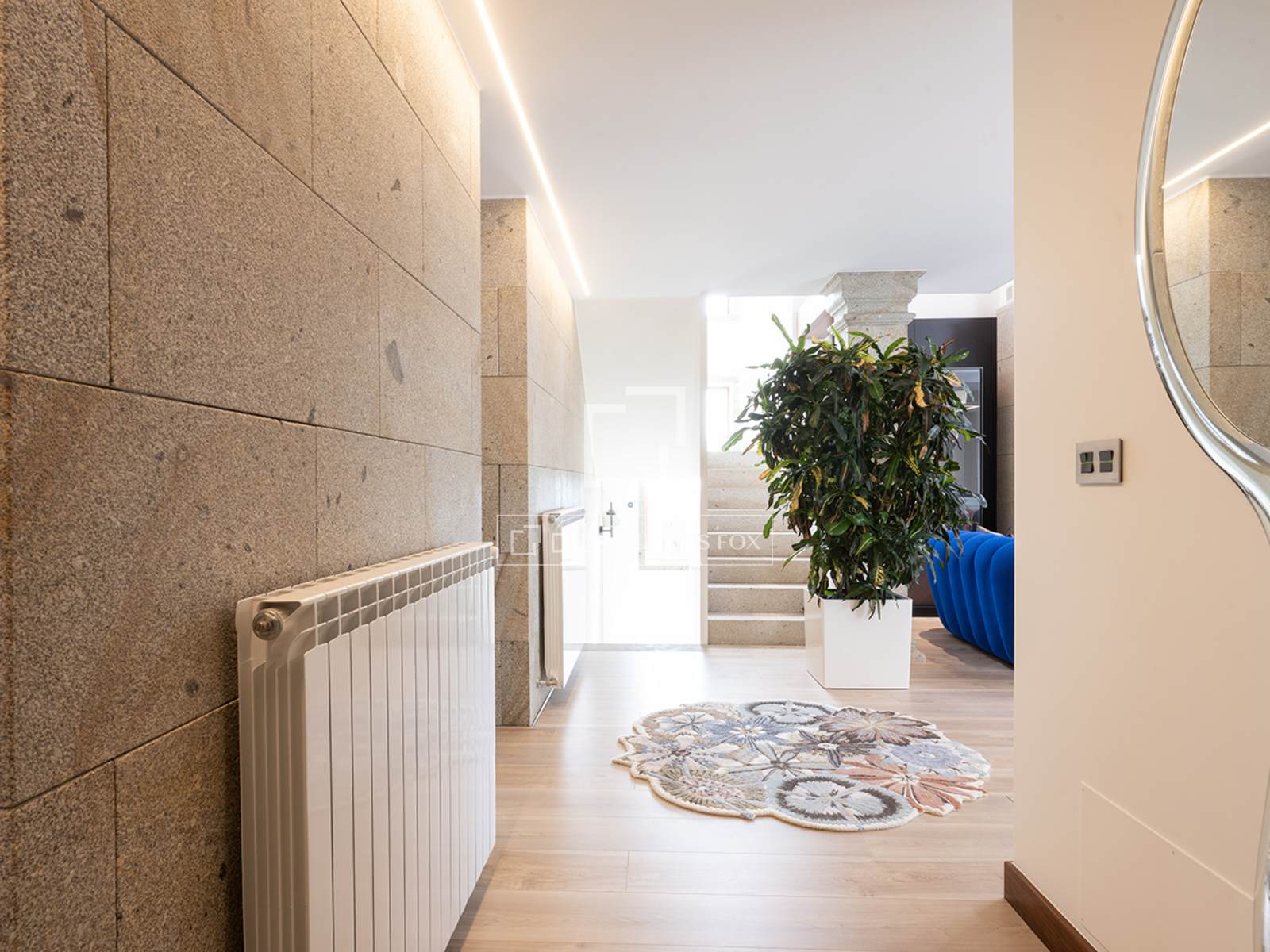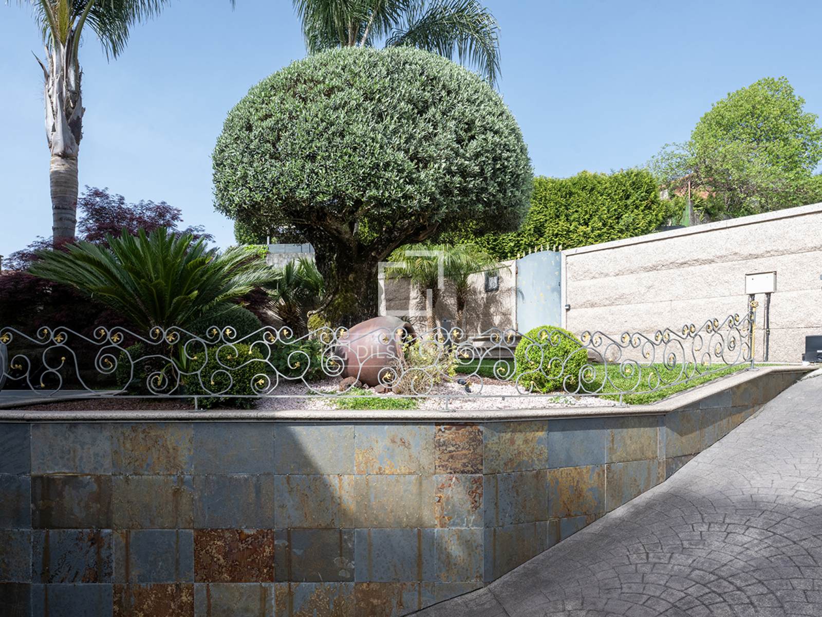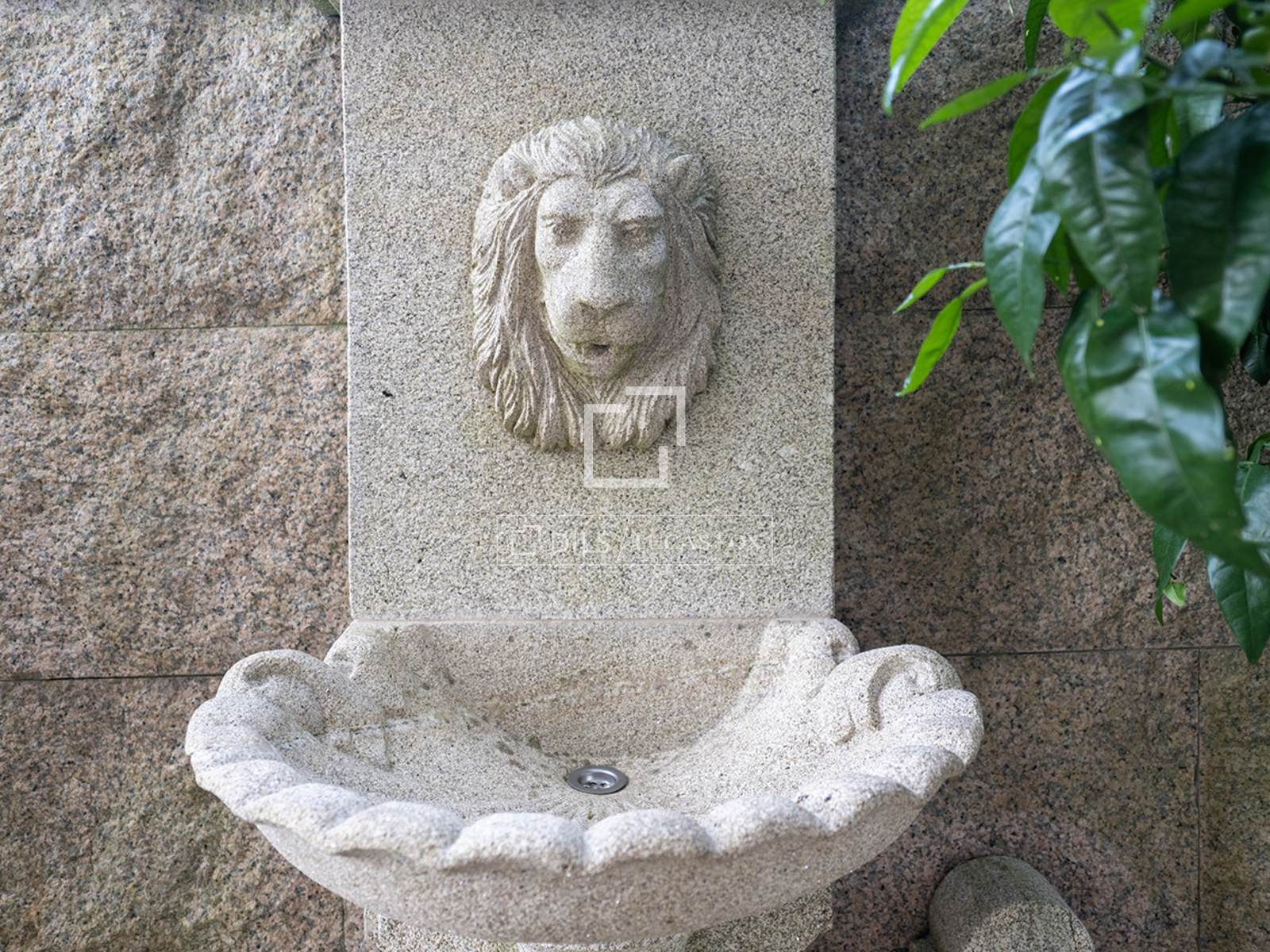 От входа тропинка, извивающаяся среди растительности и мимо многовекового оливкового дерева, ведет к входной двери. Здесь сразу бросается в глаза одна из самых отличительных особенностей: розовый камень из О Порриньо, который придает характер всему дому.
