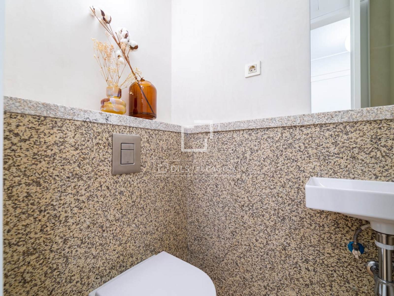 Приватная зона дома организована вокруг коридора, из которого можно попасть в две спальни с ванными комнатами. Главная спальня занимает наиболее уединенную часть планировки и имеет впечатляющую гардеробную, полностью отделанную деревом, с исключительной вместительностью и минималистичным, органичным дизайном, который также виден на фотографиях. Ванная комната дополняет это пространство высококачественными материалами, большим круглым зеркалом и тщательно подобранным сочетанием нейтральных тонов. Вторая спальня также имеет собственную ванную комнату и встроенные шкафы. Кроме того, в доме есть удобный гостевой туалет, расположенный рядом с входом.