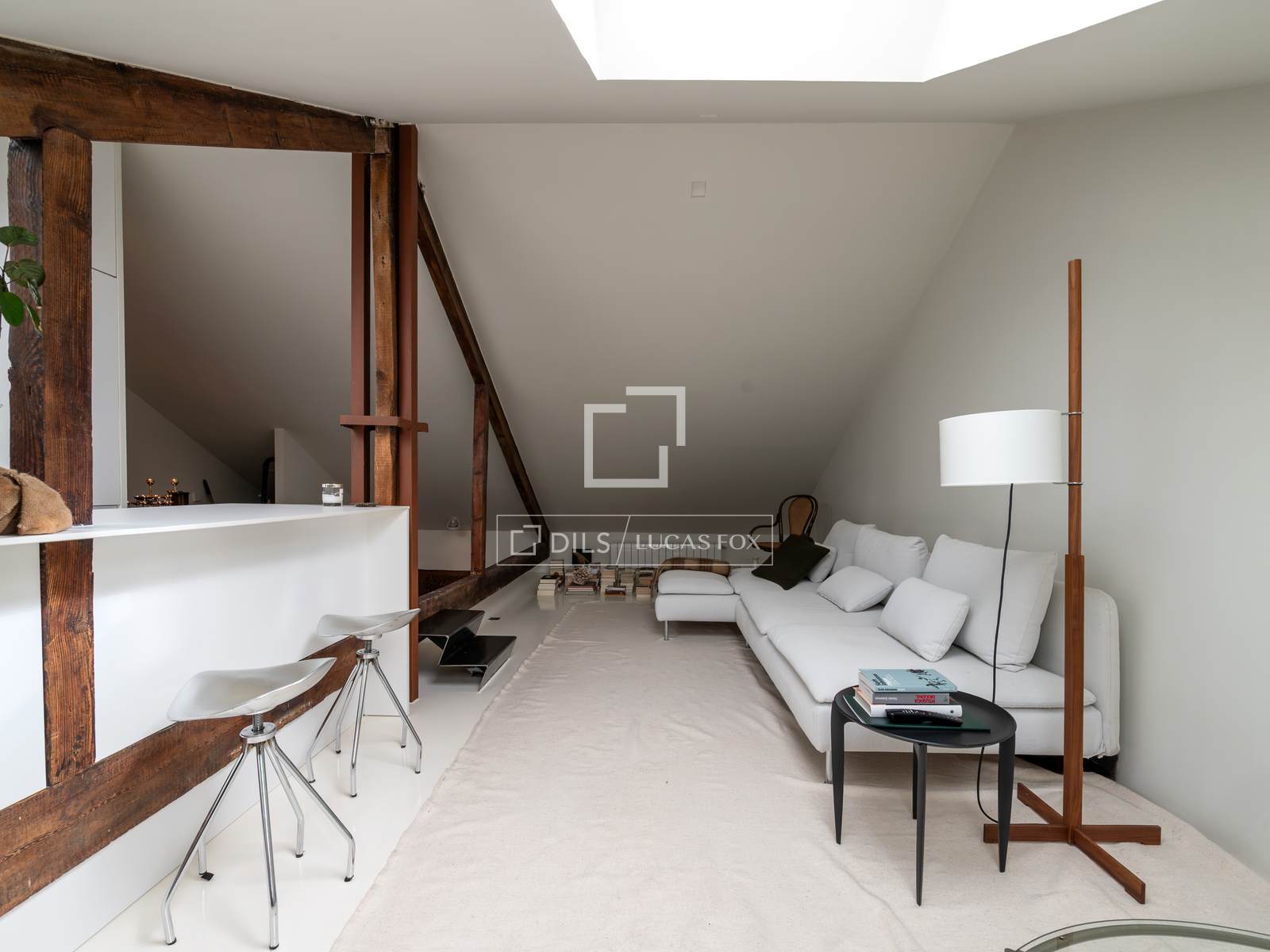 - Гостиная на мансарде с открытой кухней и центральным кухонным островом.