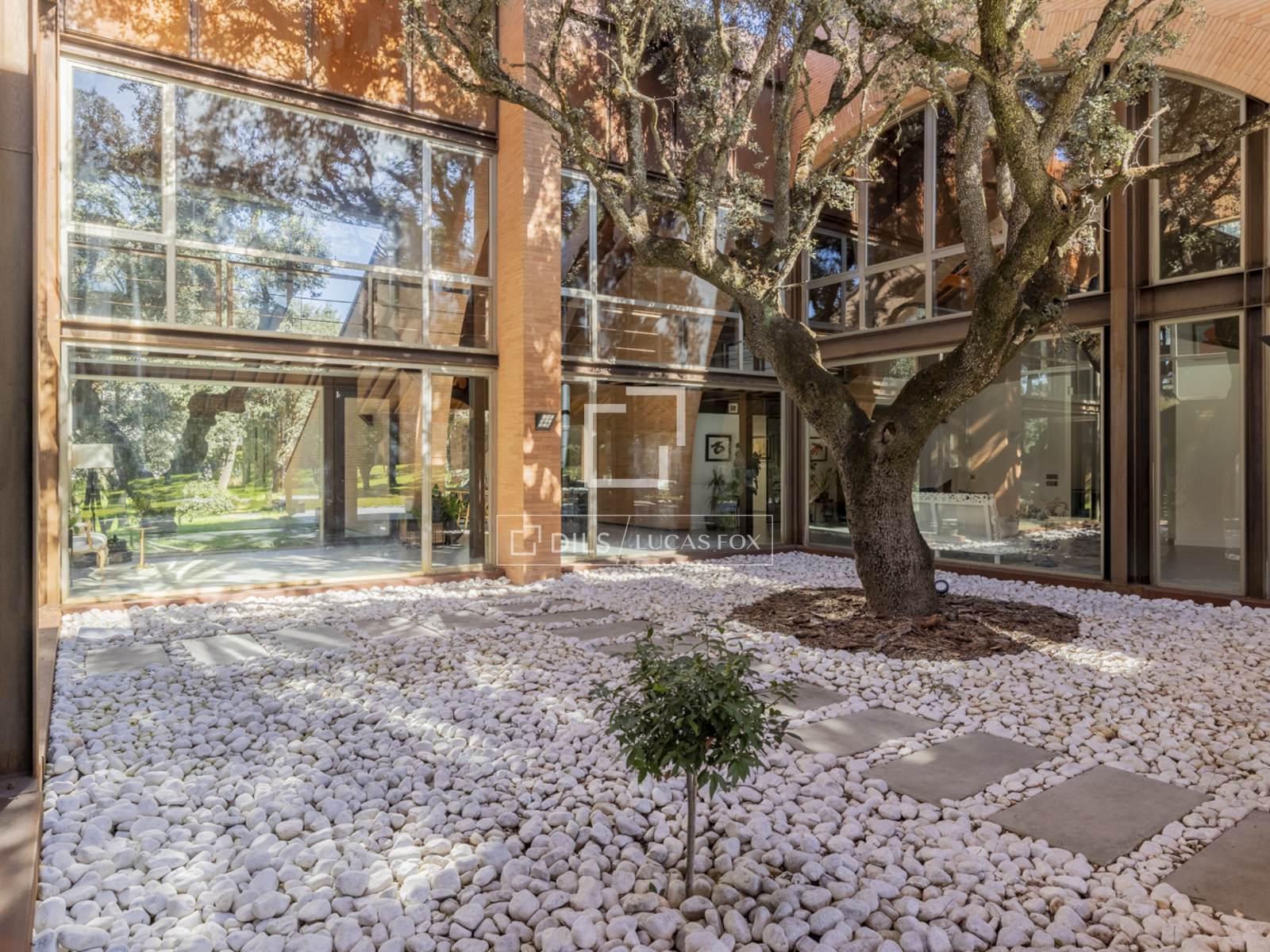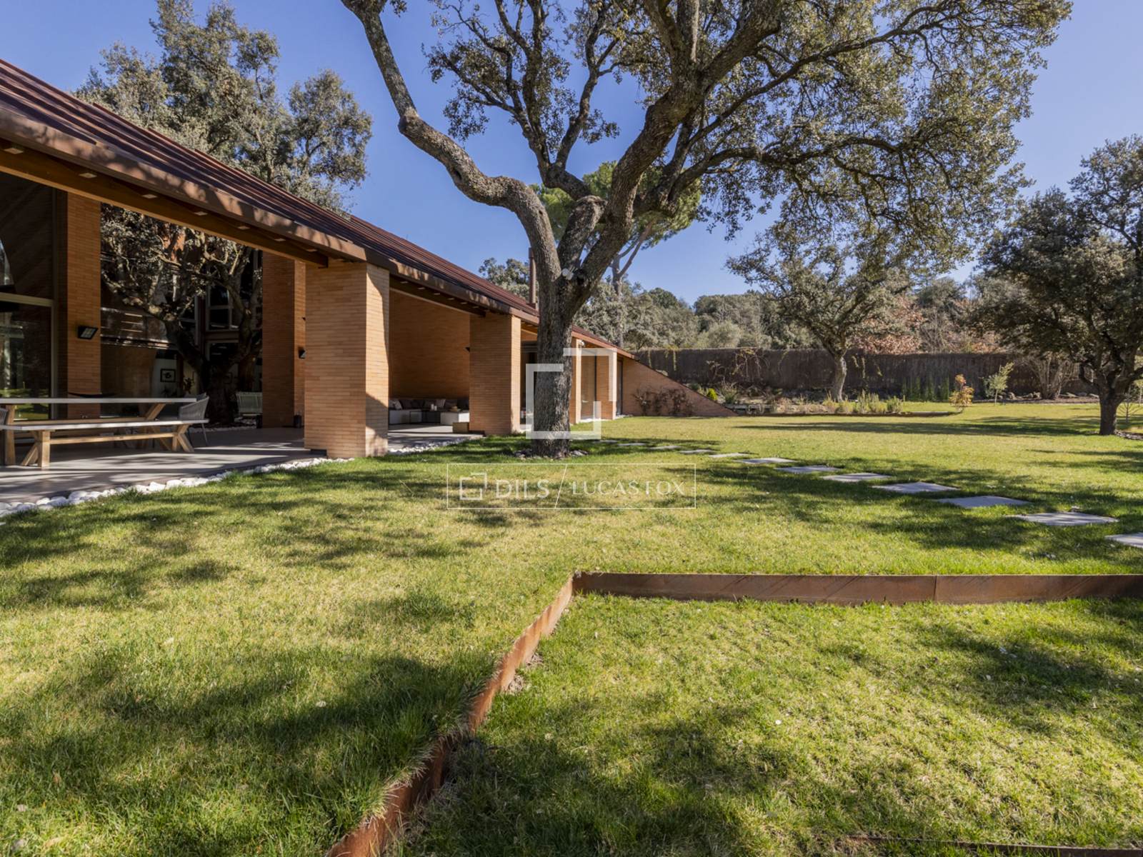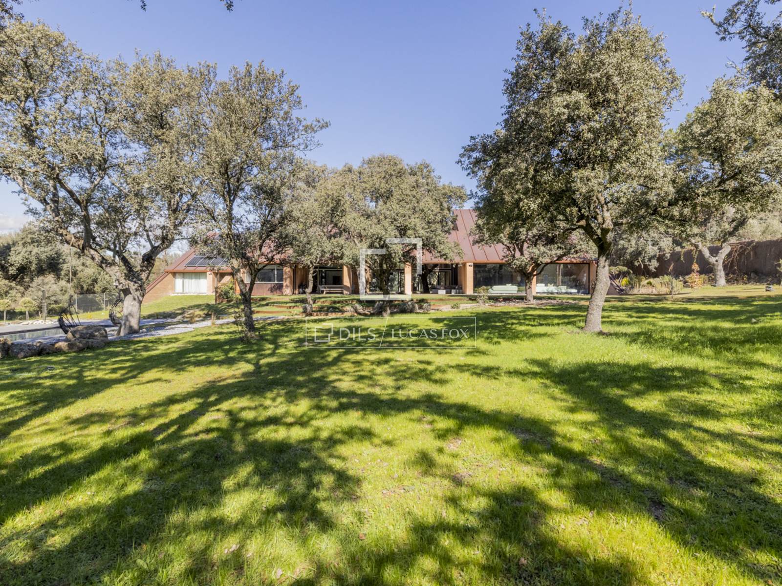 Впечатляющий дом современной архитектуры, полностью отремонтированный по высоким стандартам и интегрированный в лес многовековых дубов, выставлен на продажу в эксклюзивном закрытом поселке Прадо Ларго в Посуэло.