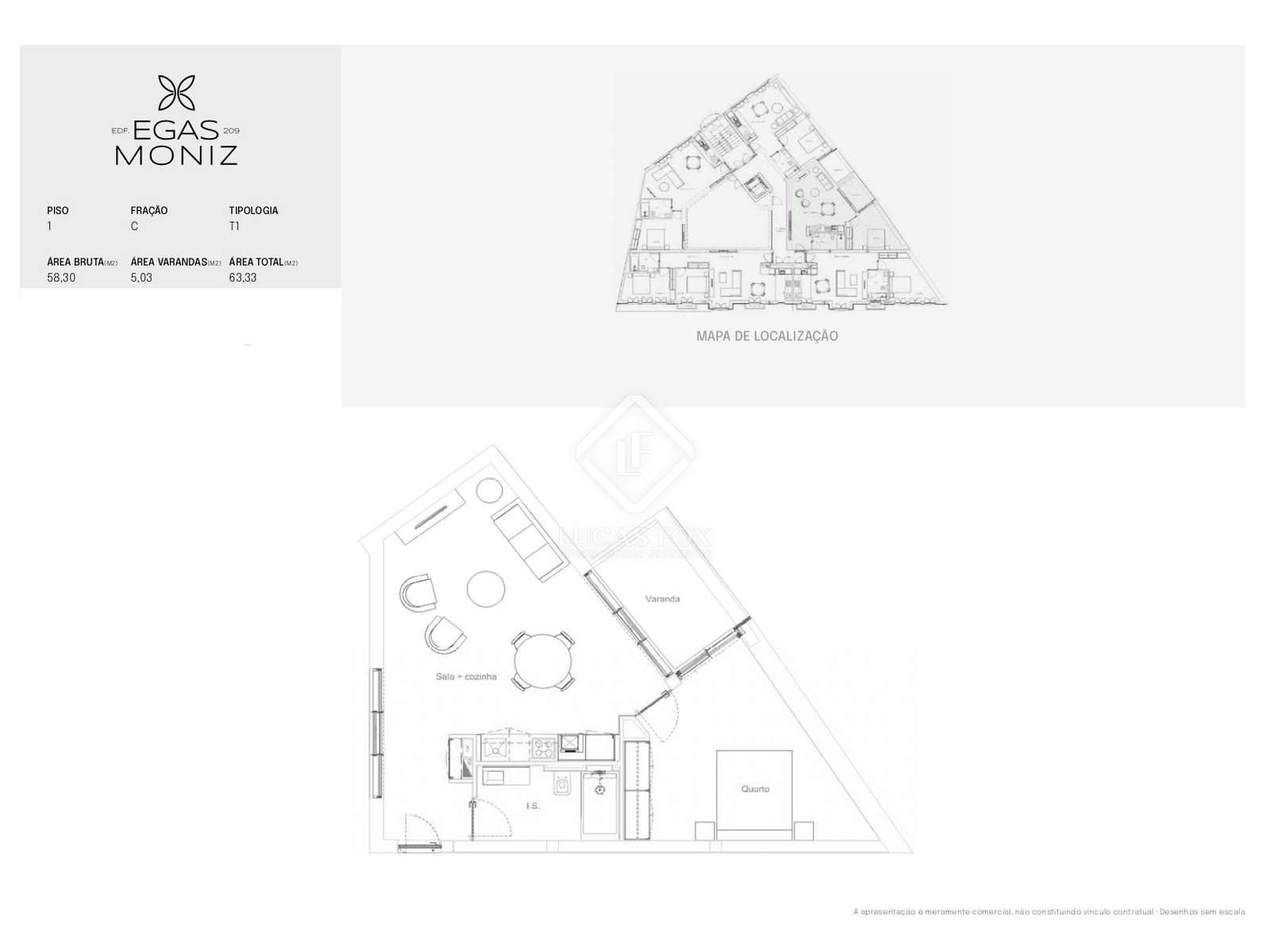 Однокомнатная квартира общей площадью 63 м², из которых 58 м² приходится на жилую площадь и 5 м² на балкон, расположена в жилом комплексе, сочетающем архитектуру 1940-х годов с современными решениями для комфорта.