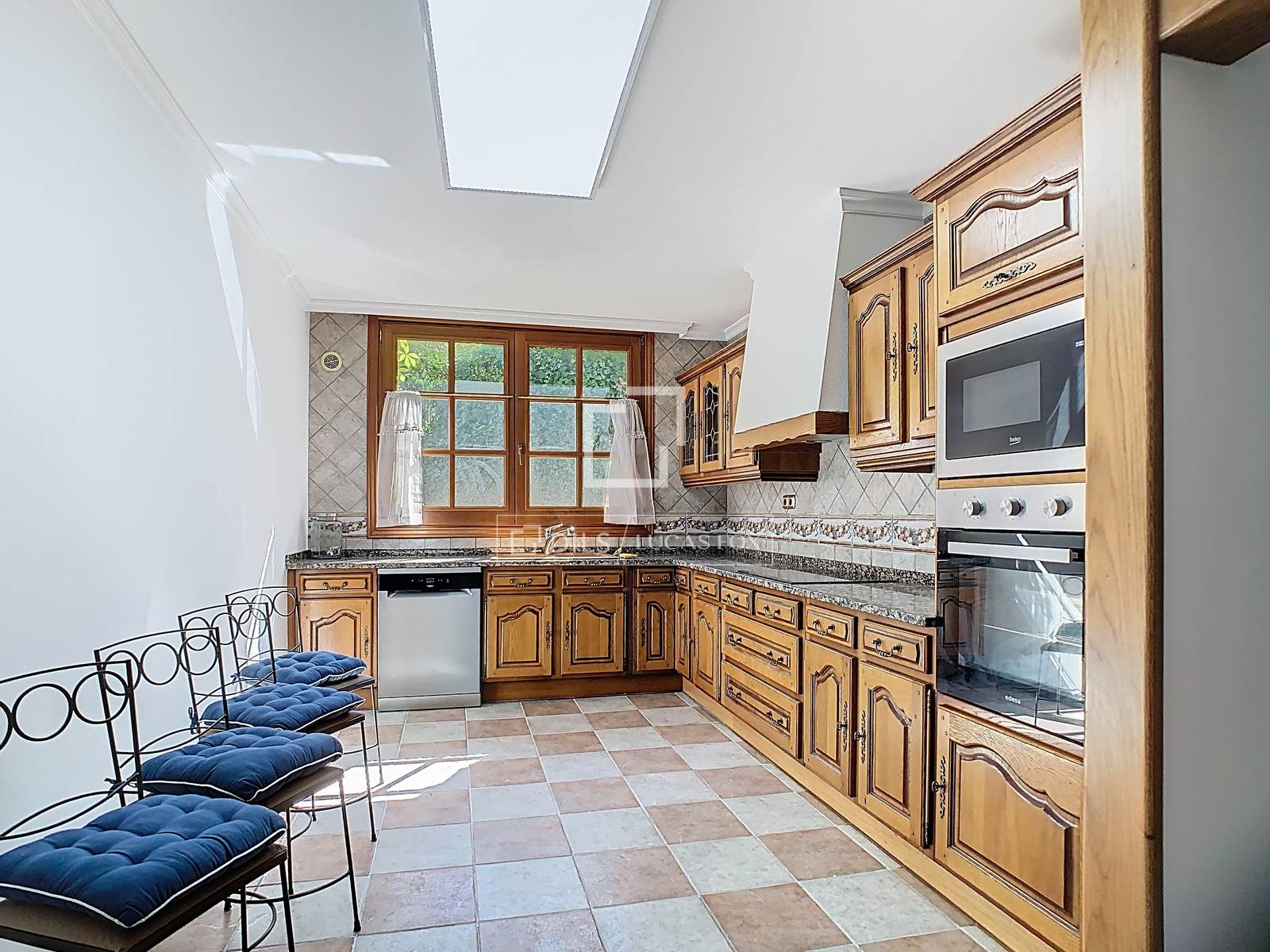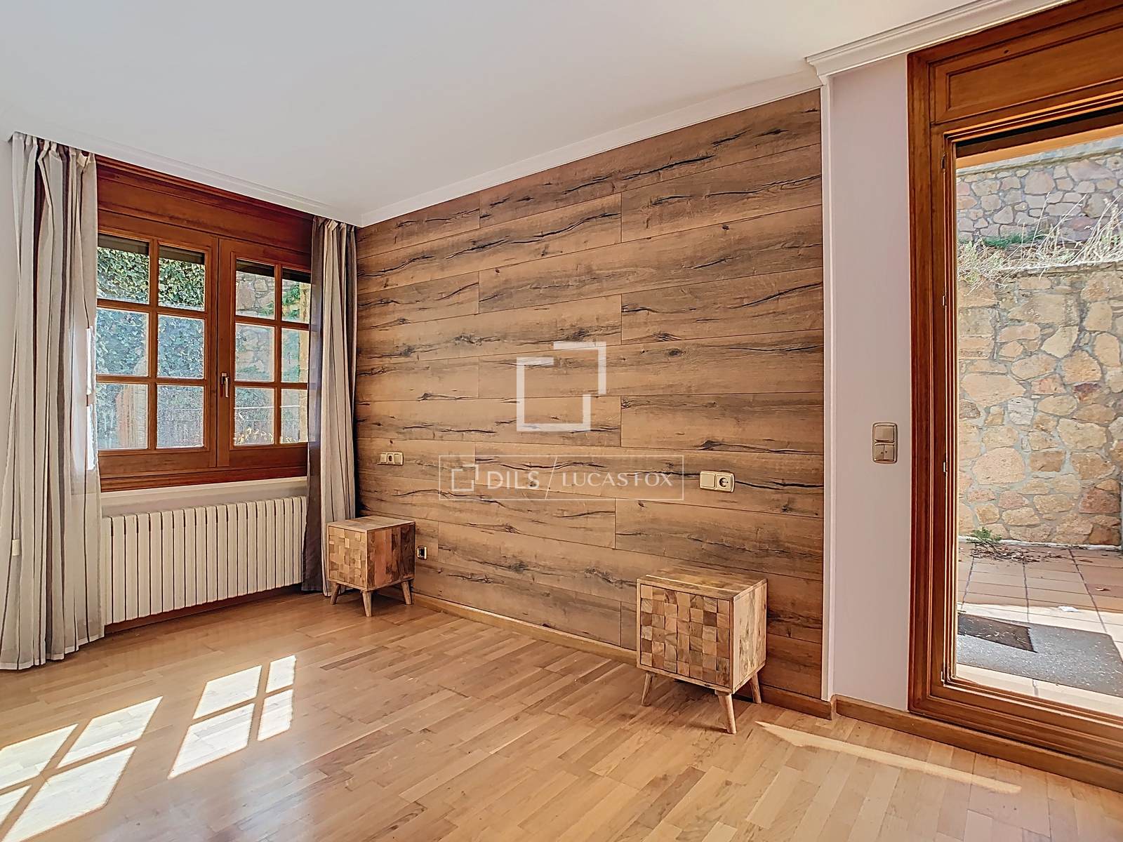 В доме есть гостиная-столовая с камином и полностью оборудованная отдельная кухня с большим количеством мест для хранения. Спальная зона включает три двухместные спальни. Главная спальня имеет собственную ванную комнату и прямой выход на просторную террасу площадью 31 м² и в сад. Две другие спальни пользуются общей ванной комнатой. Во всех спальнях есть встроенные шкафы.