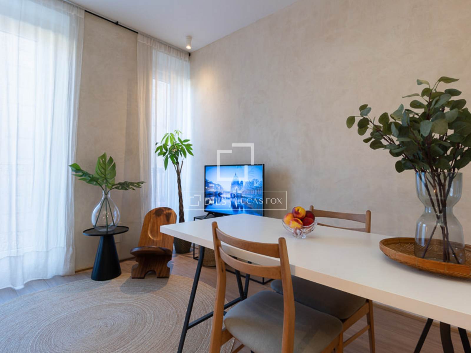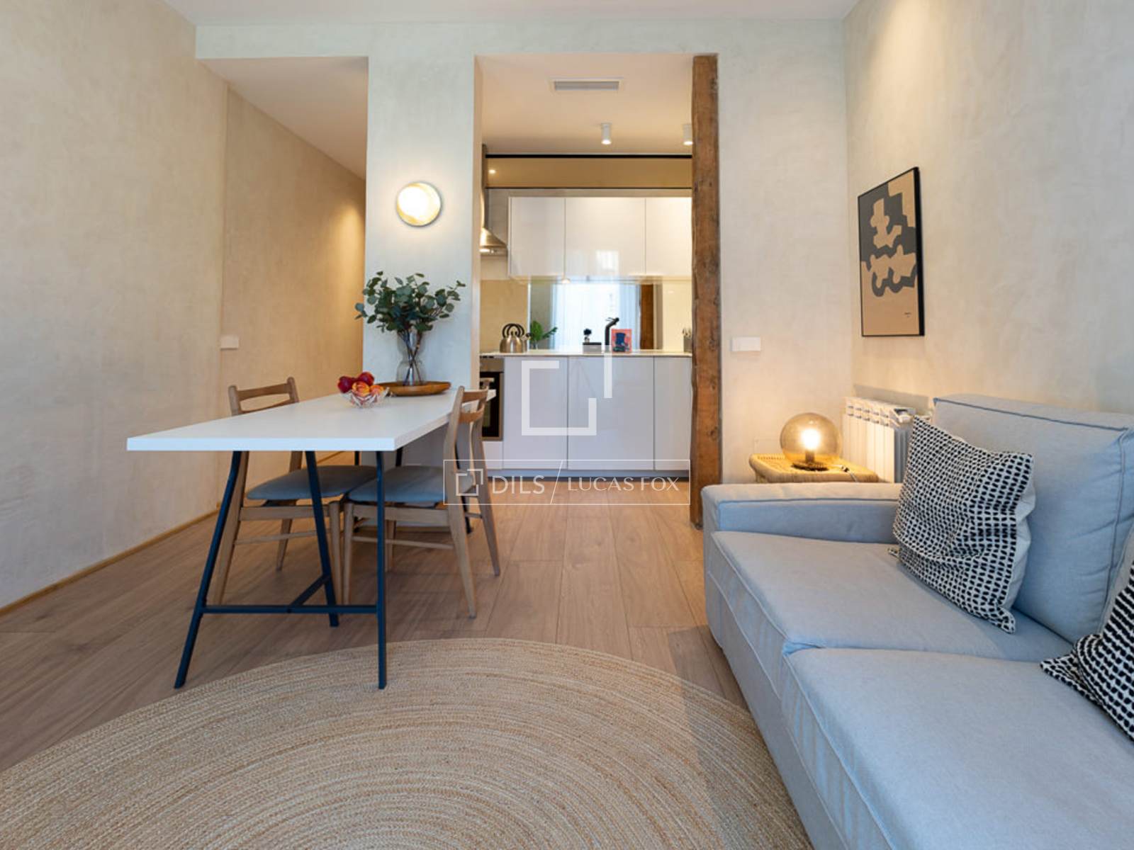 При входе коридор ведет в гостиную-столовую с открытой кухней в американском стиле. Примерно посередине коридора, слева, находится вторая спальня с односпальной кроватью, встроенным шкафом и стеклянной дверью, занавешенной гирляндами. В гостиной расположен светло-серый диванчик, прямоугольный обеденный стол с двумя деревянными стульями в винтажном стиле, большой телевизор, приставные столики и привлекательный стул из темного дерева. Из гостиной есть балкон с прекрасным видом на улицу и колокольню монастыря Святой Марии Магдалины. Этот участок улицы Пелайо очень тихий, что резко контрастирует с остальной частью района. L-образная кухня, интегрированная в гостиную, выполнена в белом цвете с каменной столешницей. Она полностью оборудована посудой на шесть человек и современной бытовой техникой (плита, вытяжка, посудомоечная машина, холодильник/морозильник). Зеркало в дальнем конце отражает свет, проникающий через окна гостиной. Пройдя по коридору обратно к входу и мимо второй спальни, вы найдете ванные комнаты (первая — туалет, а рядом с ней — ванная комната с душем и очаровательным деревянным туалетным столиком). В конце коридора находится главная спальня с двуспальной кроватью, прикроватной тумбочкой и антикварным деревянным письменным столом с лампой для чтения. В ней есть встроенные шкафы и темные шторы. В самом левом углу спальни находится закрытый шкаф, в котором расположены стиральная машина и бойлер.