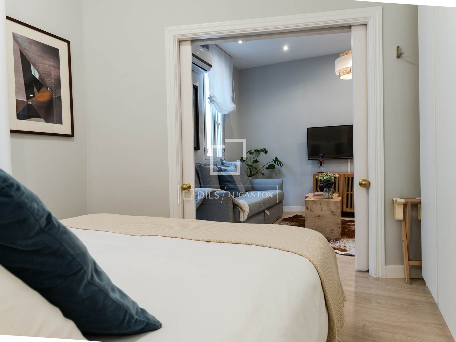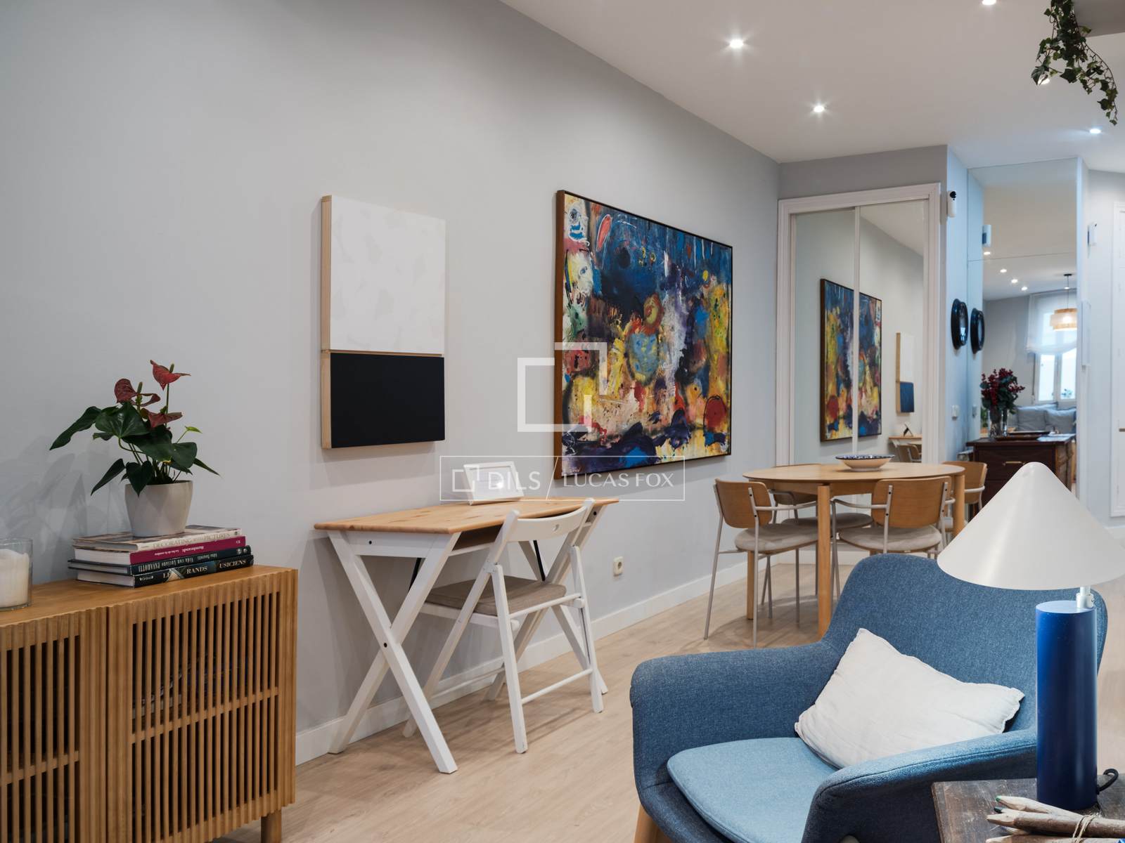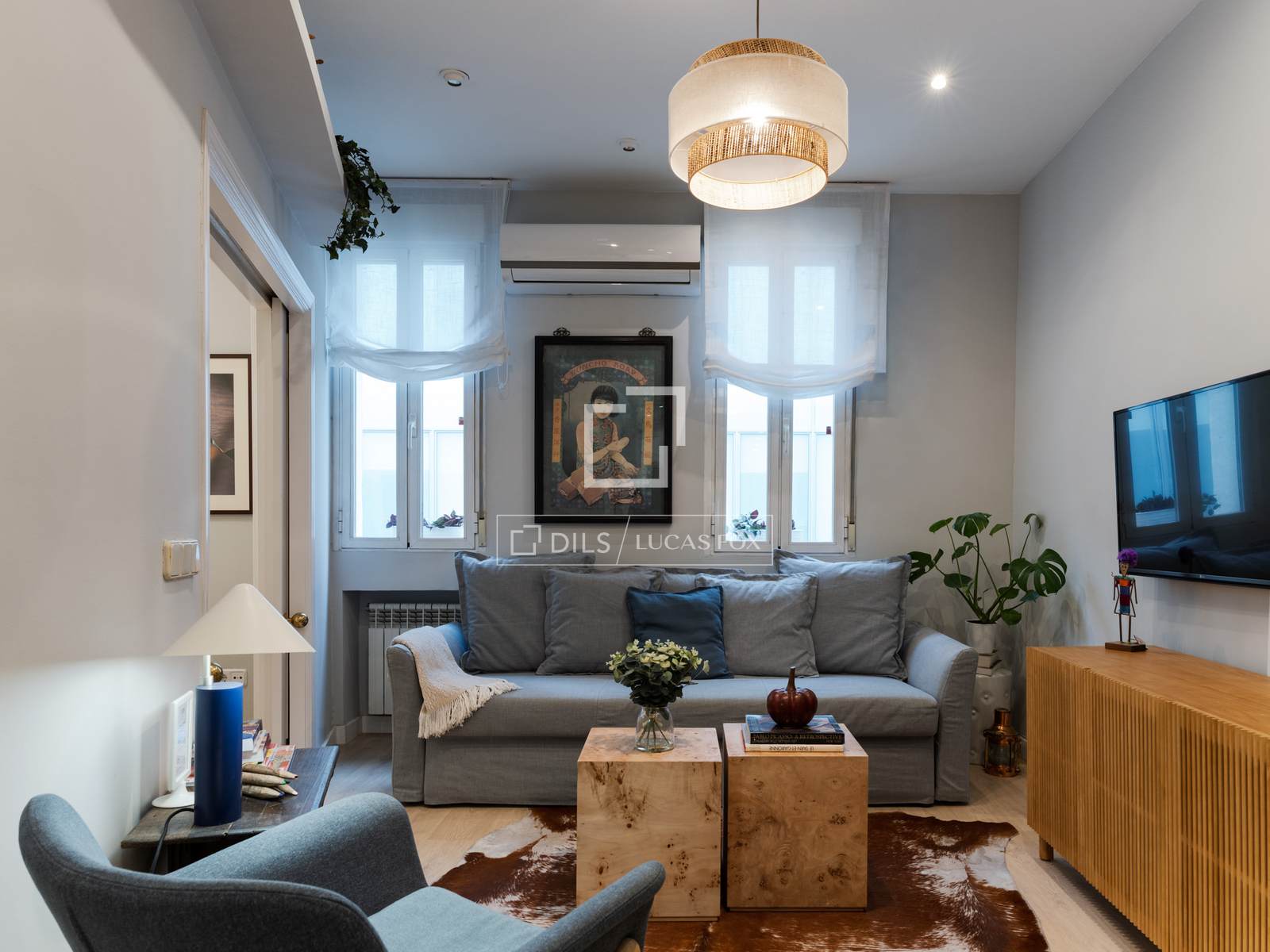 Эта уютная, практичная и современная квартира расположена на втором этаже на одной из самых знаковых улиц престижного района Саламанка, что обеспечивает тишину и покой. Благодаря окнам, выходящим на просторный внутренний дворик, квартира отличается отличным естественным освещением и идеально подходит для размещения до трех человек, или двух взрослых и двух детей. В гостиной открытой планировки находится зона отдыха, обеденный стол на четверых и полностью оборудованная встроенная кухня. Гостиная обставлена удобным диваном-кроватью на двоих, креслом, телевизором с плоским экраном, журнальными столиками и кожаным ковром. В обеденной зоне расположен прямоугольный (раздвижной) белый деревянный стол и четыре стула. Спальня отделена от гостиной раздвижной дверью и оборудована двуспальной кроватью (1,60 x 1,90 метра) с двумя небольшими прикроватными тумбочками и просторными встроенными шкафами. Ванная комната полностью отремонтирована и оборудована душевой кабиной со стеклянной перегородкой. Вход в нее осуществляется через раздвижную дверь из гостиной/обеденной зоны. Просторная и современная кухня белого цвета с кремовой каменной столешницей полностью оборудована бытовой техникой и посудой на шесть человек. Имеется несколько шкафов для хранения. Эта уютная квартира может похвастаться прекрасным центральным расположением и очень комфортным интерьером, выполненным в сдержанном и спокойном стиле. Полы во всей квартире деревянные, за исключением ванной комнаты, где плитка. В здании есть лифт и консьерж. К лифту ведут четыре ступеньки, а в коридор квартиры – еще одна ступенька.