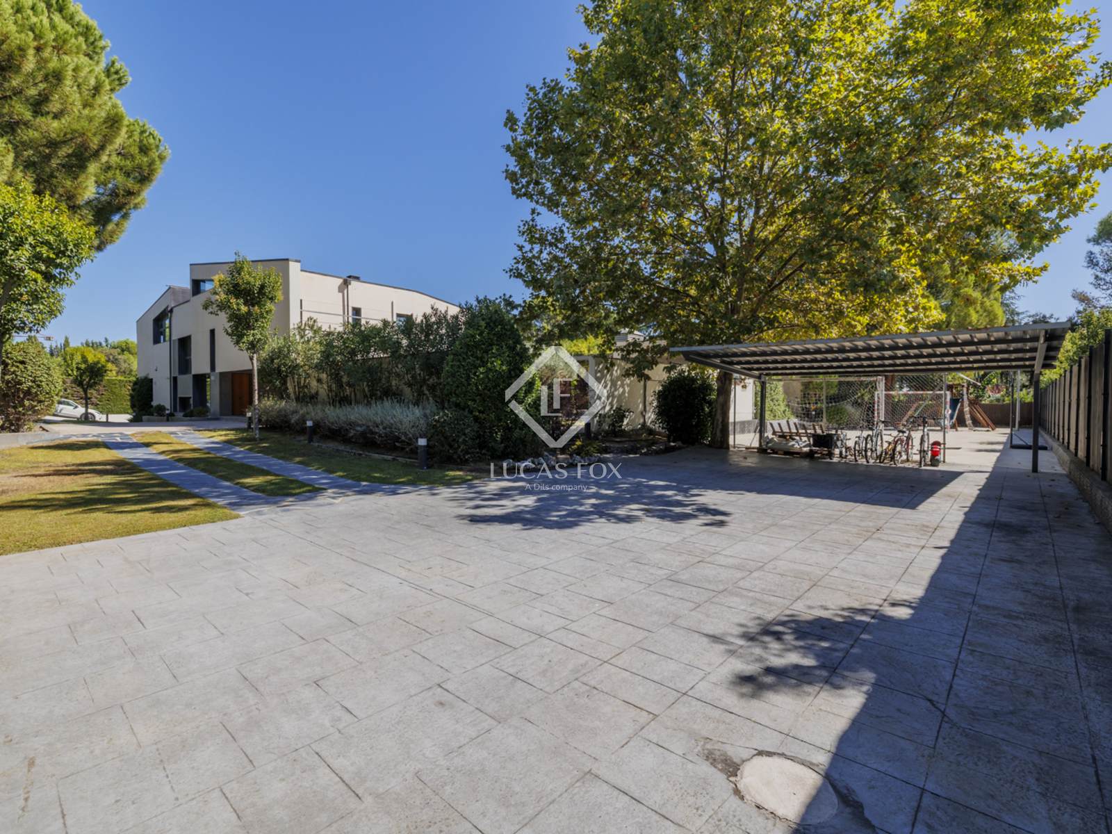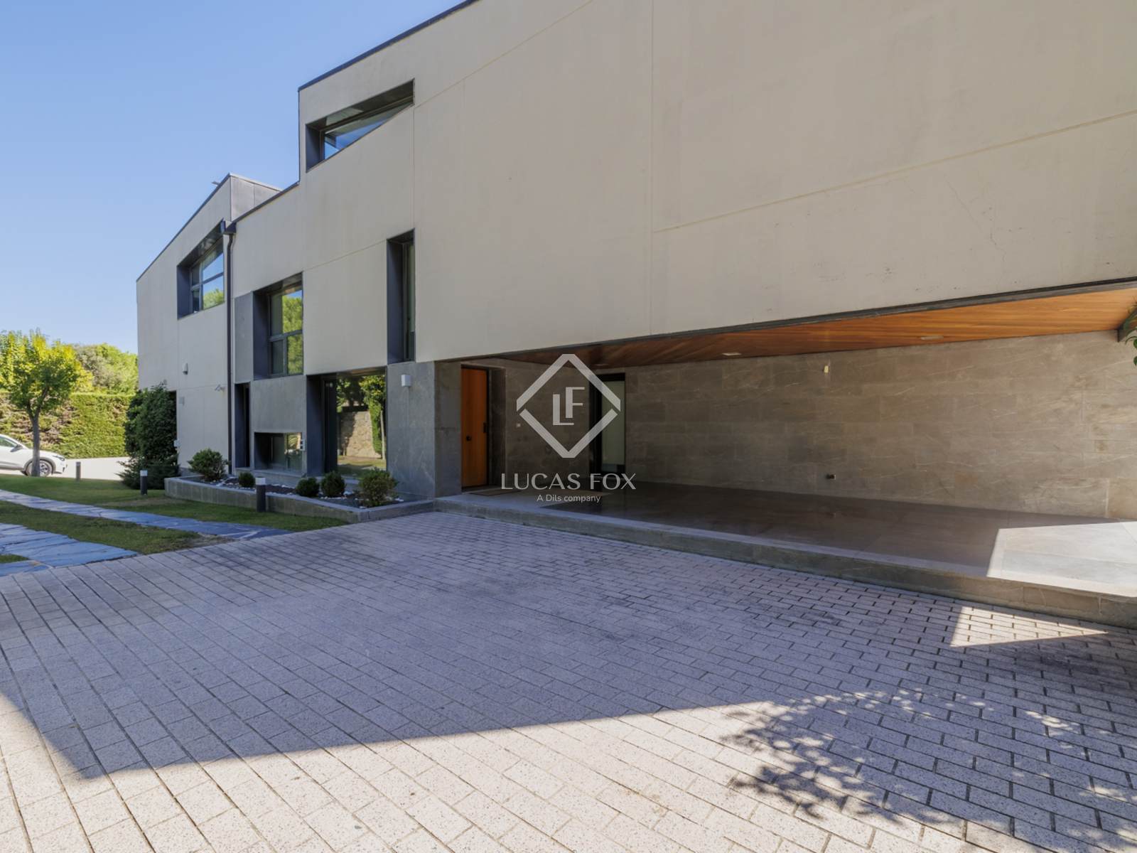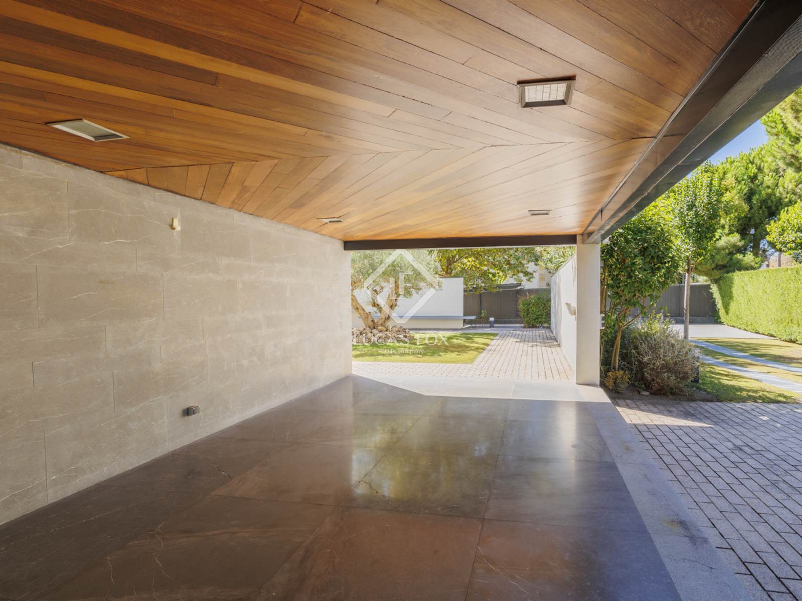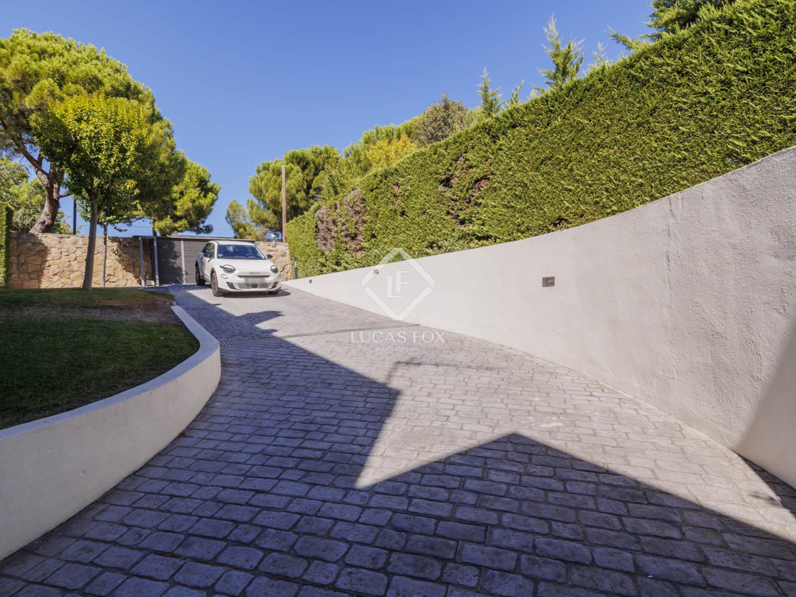 Въезд на территорию осуществляется через автоматические ворота, ведущие на частную подъездную дорогу, которая ведет либо в подземный гараж на 4 машины, либо на открытую крытую парковку рядом с домом с легким доступом к кухне и подсобному помещению.