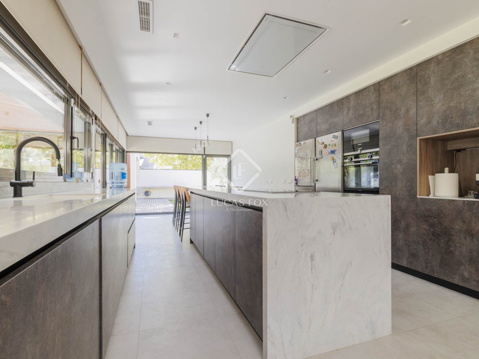 Между гостиной и столовой находится очаровательный камин, а пройдя направо из столовой, попадаем в современную, полностью оборудованную кухню с высококачественной техникой. Из кухни и столовой также есть прямой выход на веранду.